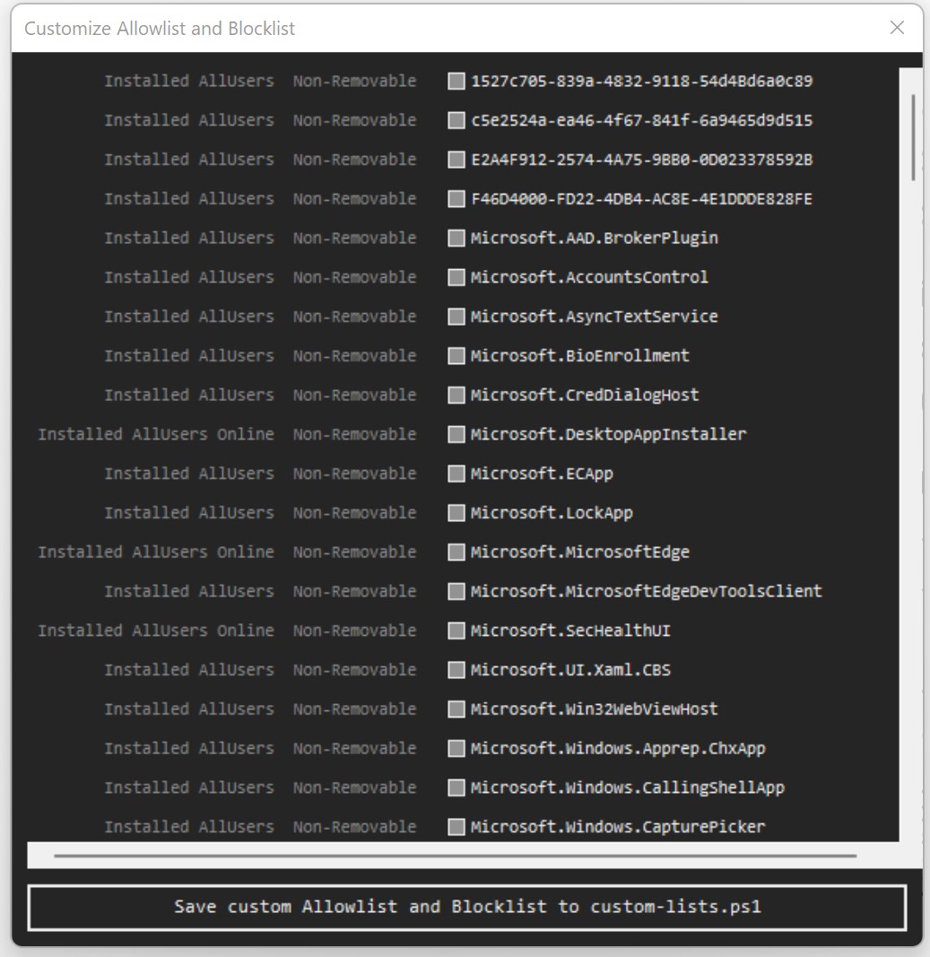 The list looks daunting, but you can scroll down and untick apps you want to keep. Press save and close this window. You go back to the previous window and press ‘Remove Bloatware with custom blocklist’. It does its job, and then you restart the computer.