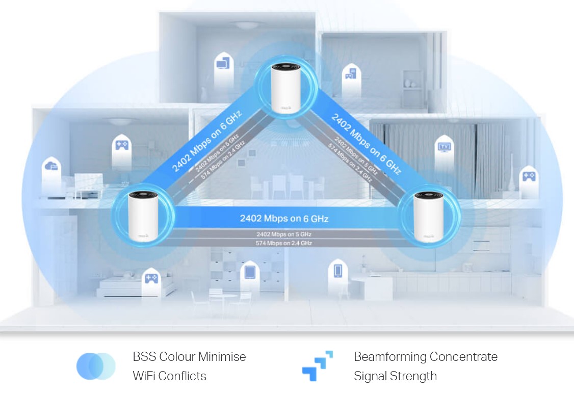 With Wi-Fi 6, the better AX11000 mesh routers and satellites use a Tri-band setup – 2.4Ghz (up to 600Mbps), 5GHz-1 (up to 4800Mbps) and 5GHz-2 (up to 4800Mbps). If you use Wi-Fi backhaul from the satellites, it uses the 5GHz-2 channel.