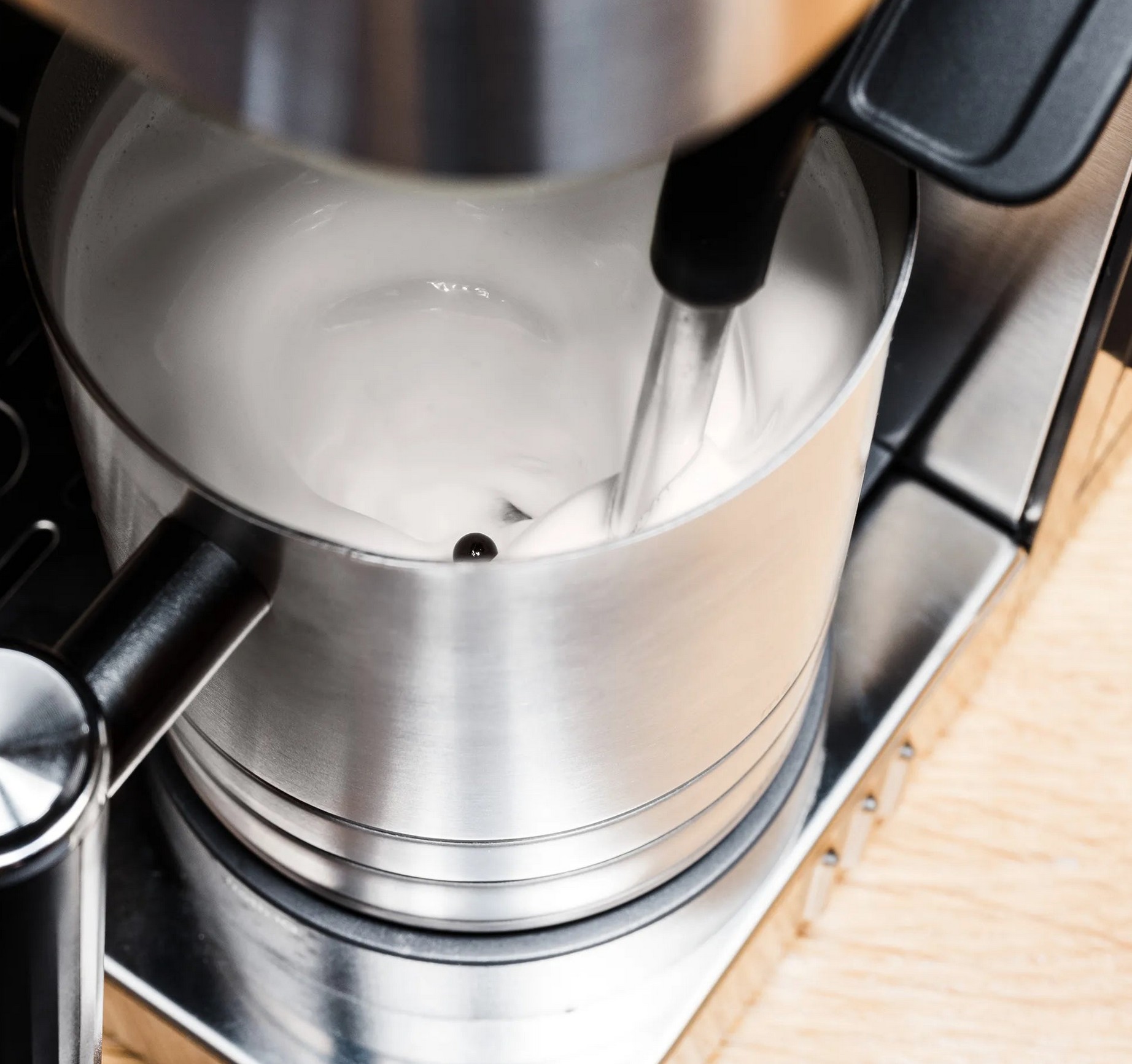 • Dual froth induction milk jug and steam frother wand (milk and plant substitute settings), and a setting for the amount of froth.