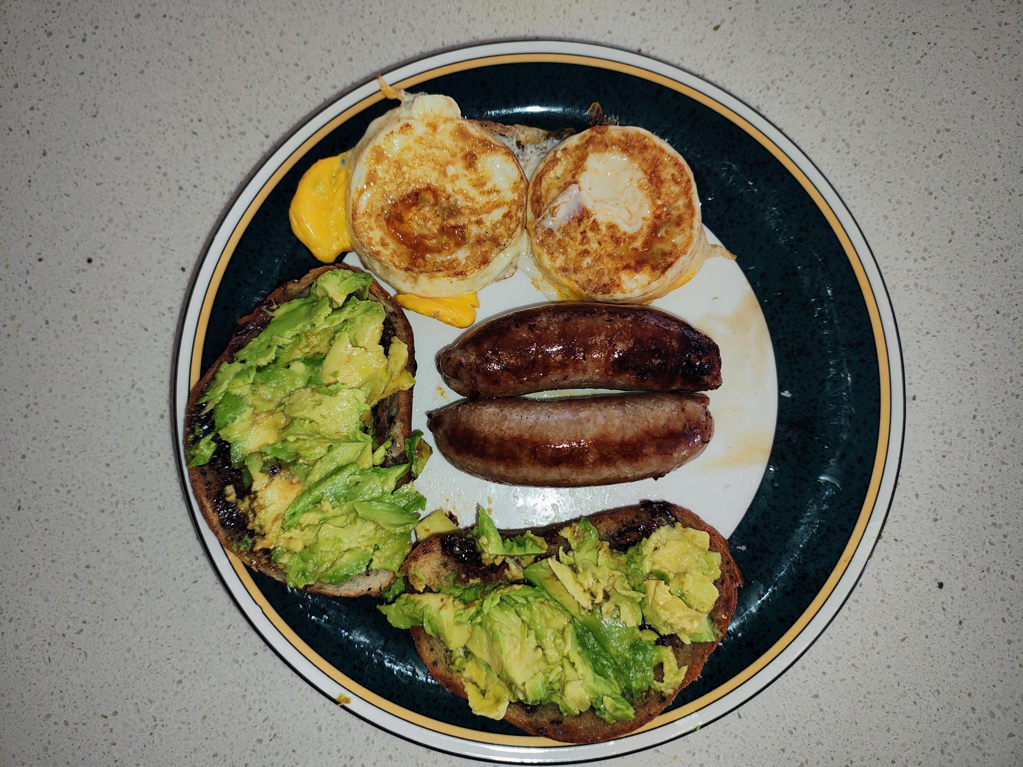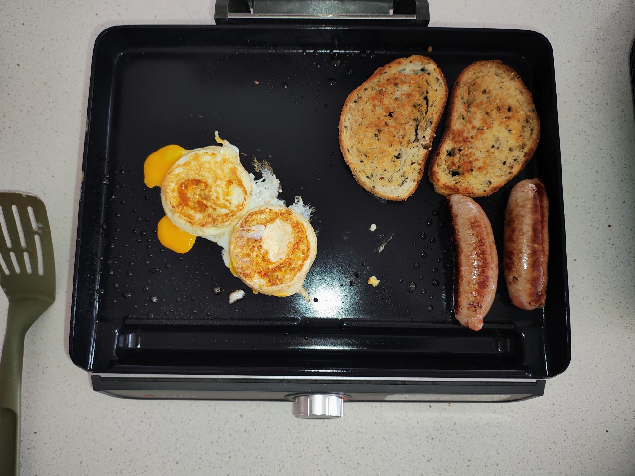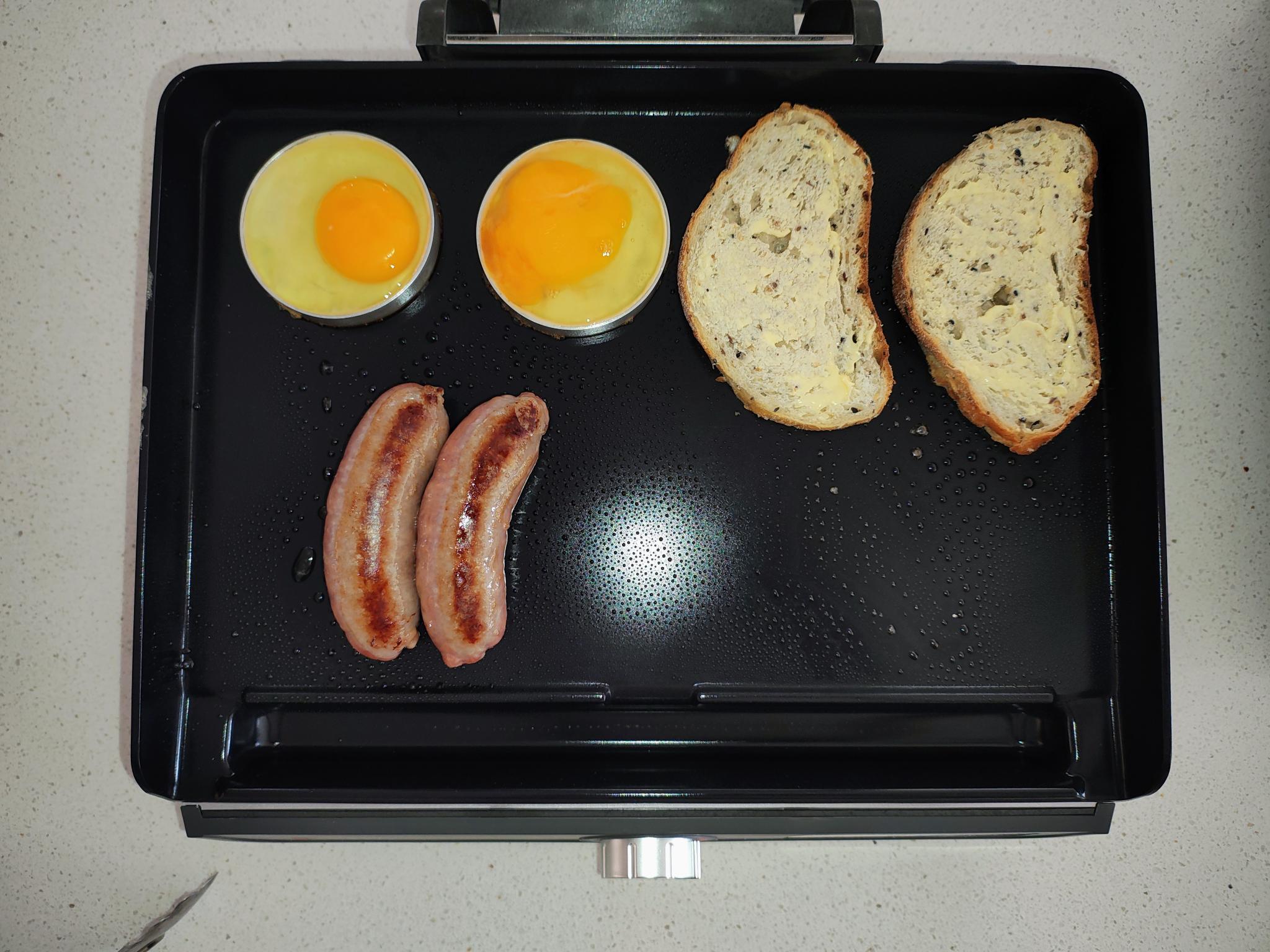 I tried the flat plate with two lamb sausages, grilled eggs, and sourdough bread (lightly buttered both sides) and had a great breakfast in under 10 minutes (the sausages take the longest and need to be quarter turned every two minutes). I selected 180° as the quick start guide recommended. Yes, it began to smoke at about 8 minutes, so I took the eggs and bread off and lowered the lid, which made a small difference.