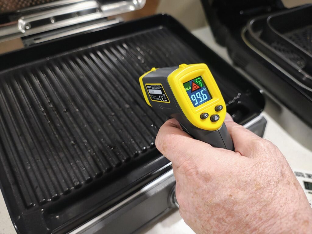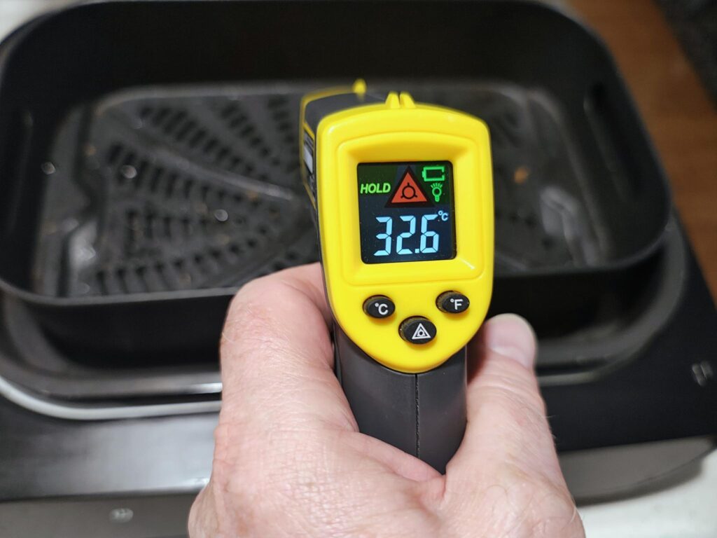 One trap was that the plates were still 100° about 10 minutes after use – too hot for hands and to wash. It took about 20 minutes to reach 50°. By comparison, the Ninja Foodi Air Fryer was 32.6°. That’s another good use for the IR Thermometer.