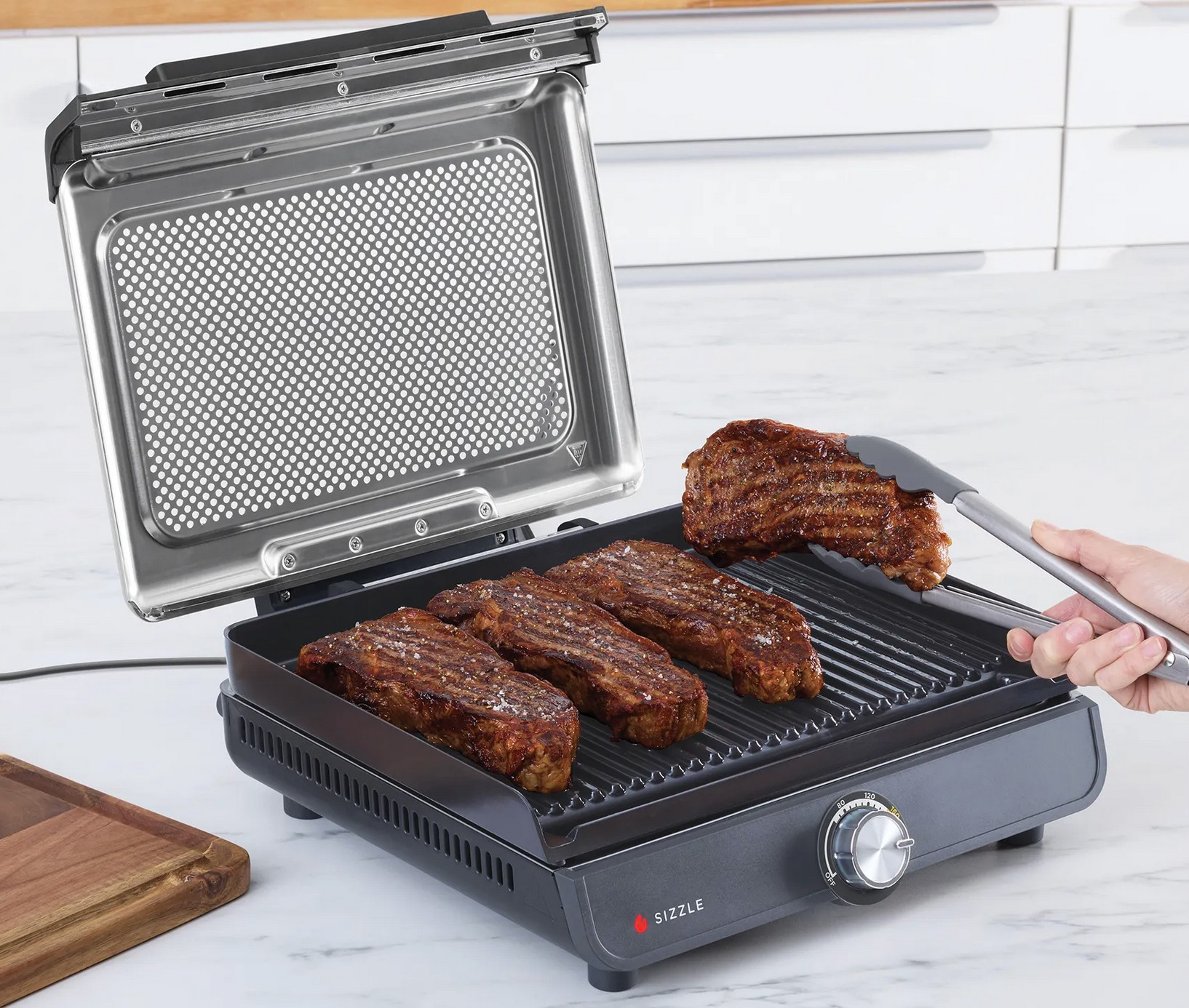 It’s essentially an electric indoor BBQ with both a flat and sizzle ribbed grill plate. It has a lightweight stainless steel hood that you can lift or lower during cooking.