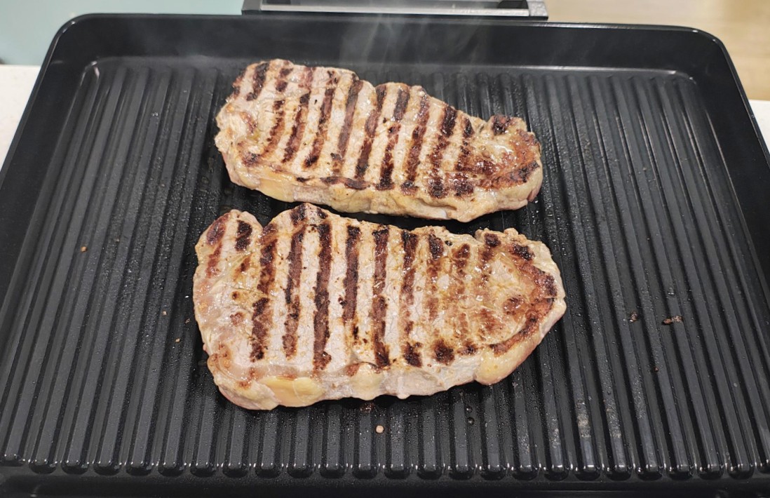 It does not advertise the coating, but you can safely assume it is some kind of PFOS and PTFE-free surface. But it is not 100% non-stick like you may find on a Teflon frypan. Once the meat juices start to caramelise, it can stick to the sear ‘grid lines’. Grilled eggs can stick to the flat plate. Not badly. We initially used cannola spray but found it created smoke (see later).