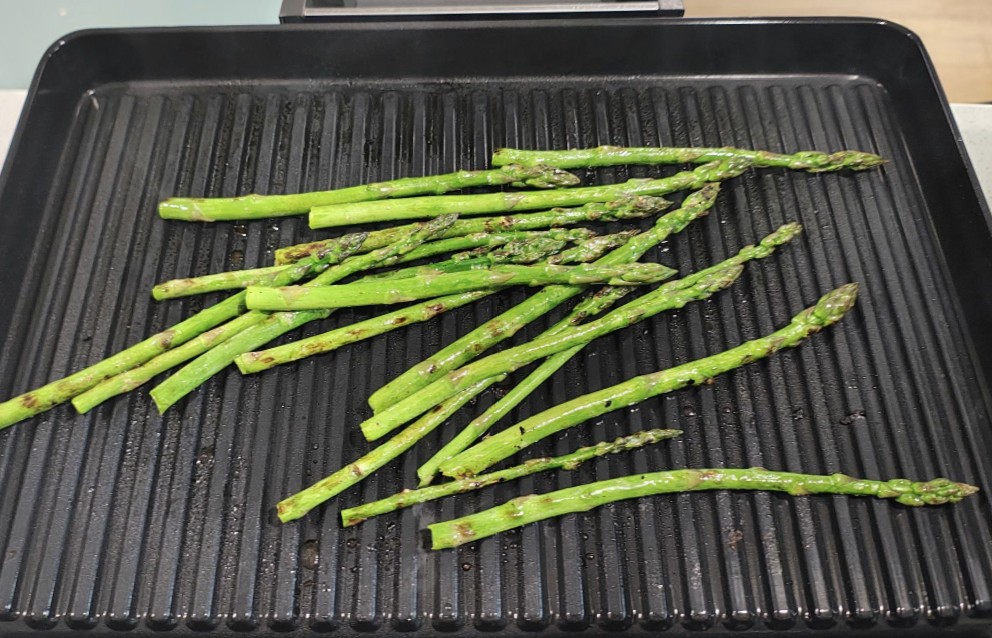This is where I learned the folly of marinade when two marinated porterhouse steaks (olive oil, salt, pepper, lemon, garlic) stuck to the plate and started smoking. I also tried to grill baby asparagus (lightly coated in olive oil and Himalayan salt), which was OK.