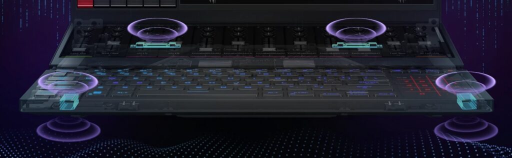 It has left and right stereo speakers under the keyboard deck. There are bottom vents with down-firing speakers and finally tweeters under the second screen.