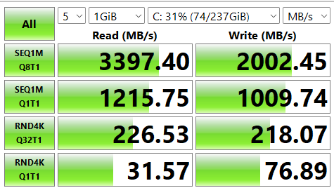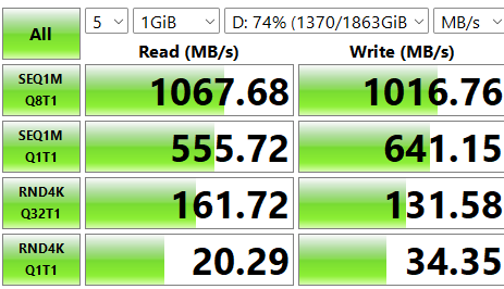 CPDT (Cross Platform Disk Test measures sustained throughput) gave a sequential read/write result of 2110/666MBps, which is in the Tier 2 SSD performance range. Crystal Disk Mark gives it 3397/2002MBps using a different testing regimen.