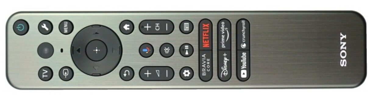 Sony calls it a premium Bluetooth and IR (Infrared) remote with backlit buttons, a microphone, an accelerometer, and a metal deck. However, progress has its cost, as it has no numeric buttons, forcing the use of the EPG, Channel Up/Down, or Voice Assistance to change Free-To-Air (FTA) channels. Fortunately, you can purchase a genuine expanded Bravia remote for $55.