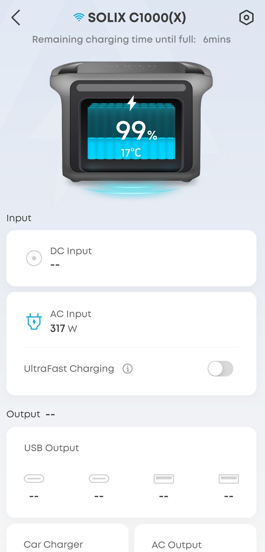 There are two models – the C1000X has 1300W AC fast charge, and the C1000 has 1000W. In any case, the ultra-fast will charge it in 54 minutes and the standard charge in 72 minutes.