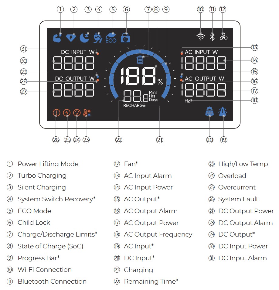 The top row of icons shows operational status. The middle shows the percentage battery capacity remaining and time (based on the current load) or battery charge % and time to full.