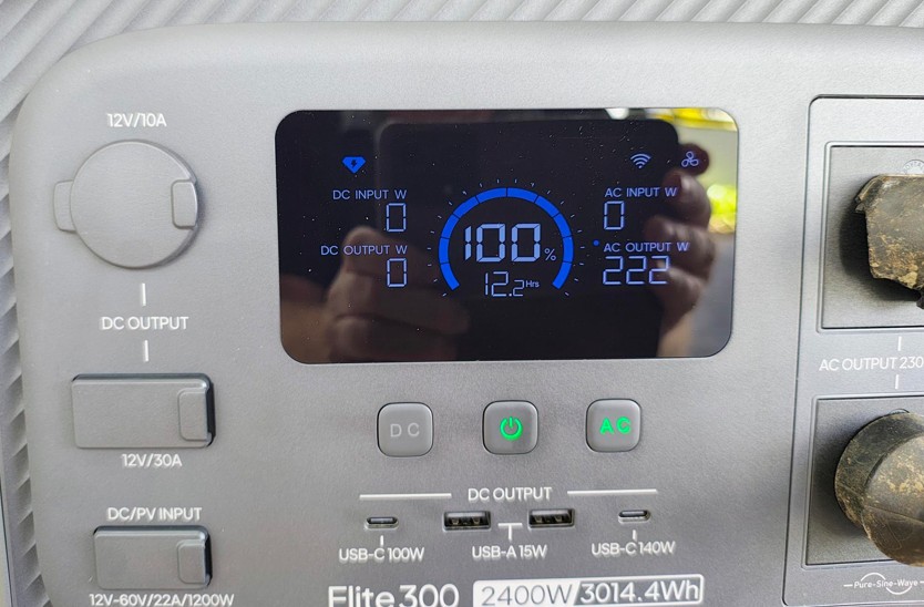 (3014.4Wh) × DoD (90%) ÷ Load (AC 200W + Elite 300’s Self-consumption 10W) = DC Operation time 12.91 hours (not tested).
