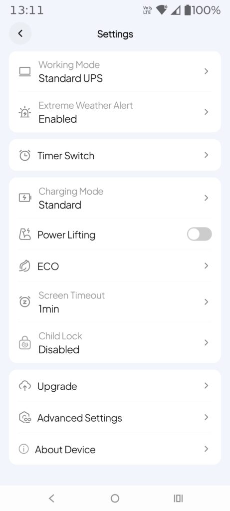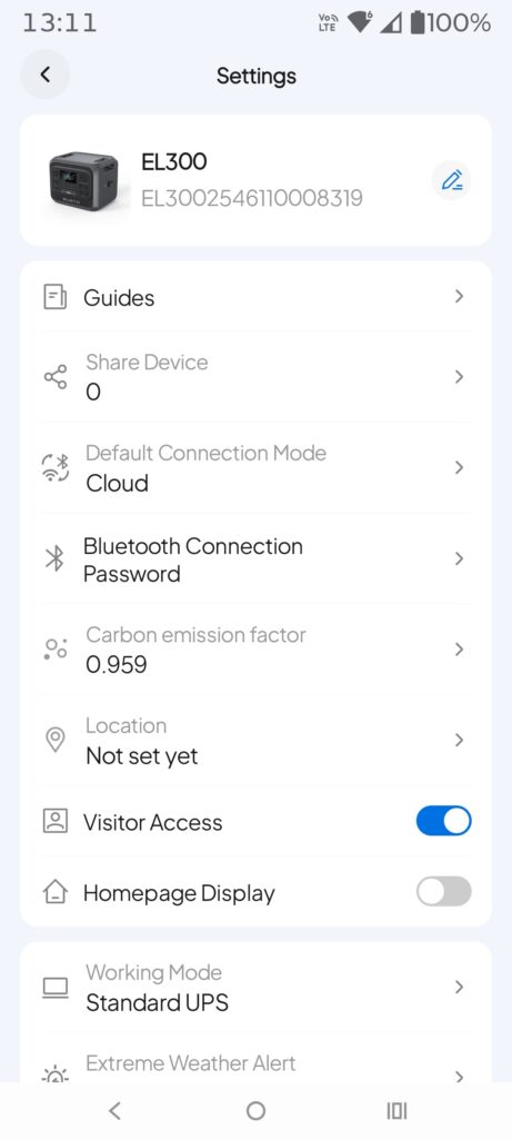 The app has grown considerably without adding complexity. You can now share a device with others, set connection types, password-protect connection types, set off-peak charge, and more. It has an Emergency Alert capability, where it will go into Backup mode using grid power and stay fully charged until you need it.