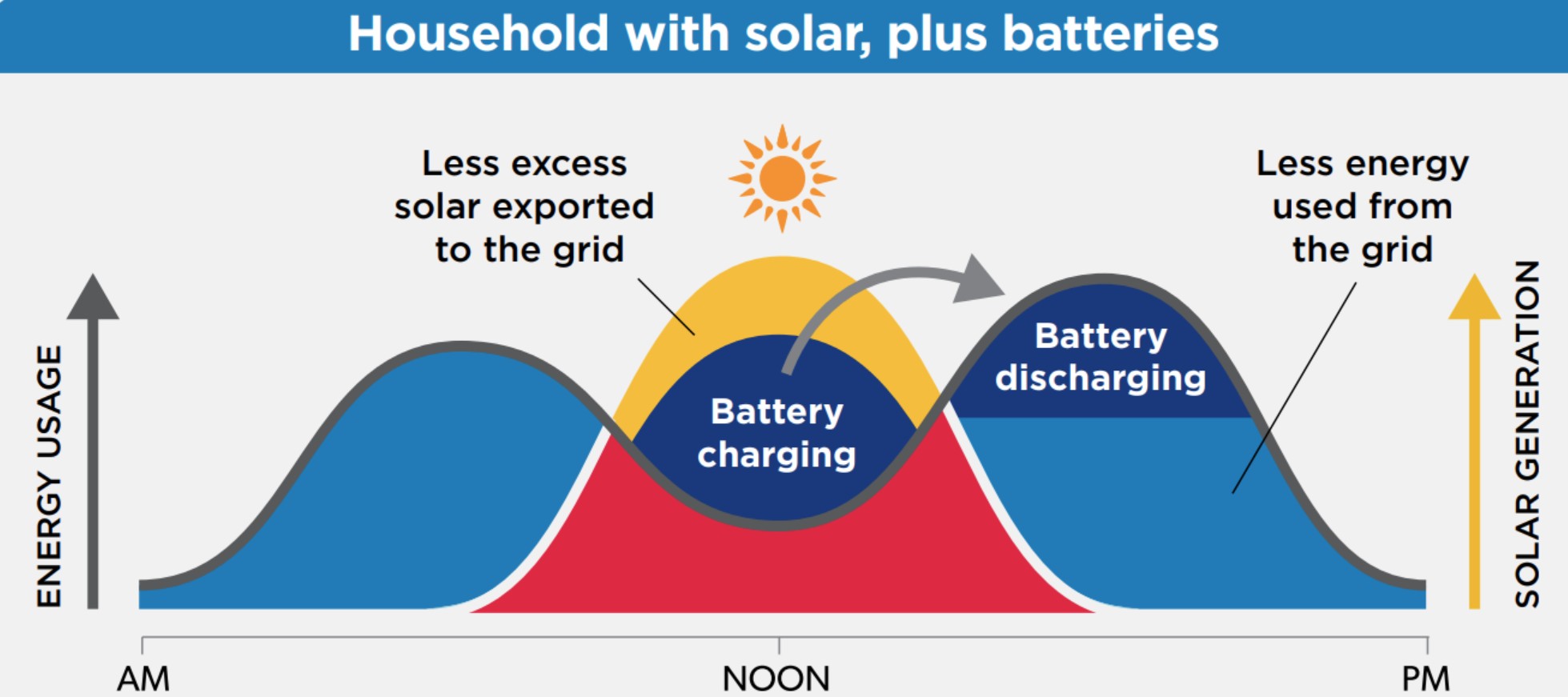 But the Catch-22 is that solar energy is generated in the middle of the day, but most of it is needed in the evening (peak period). Ah – we need your battery.