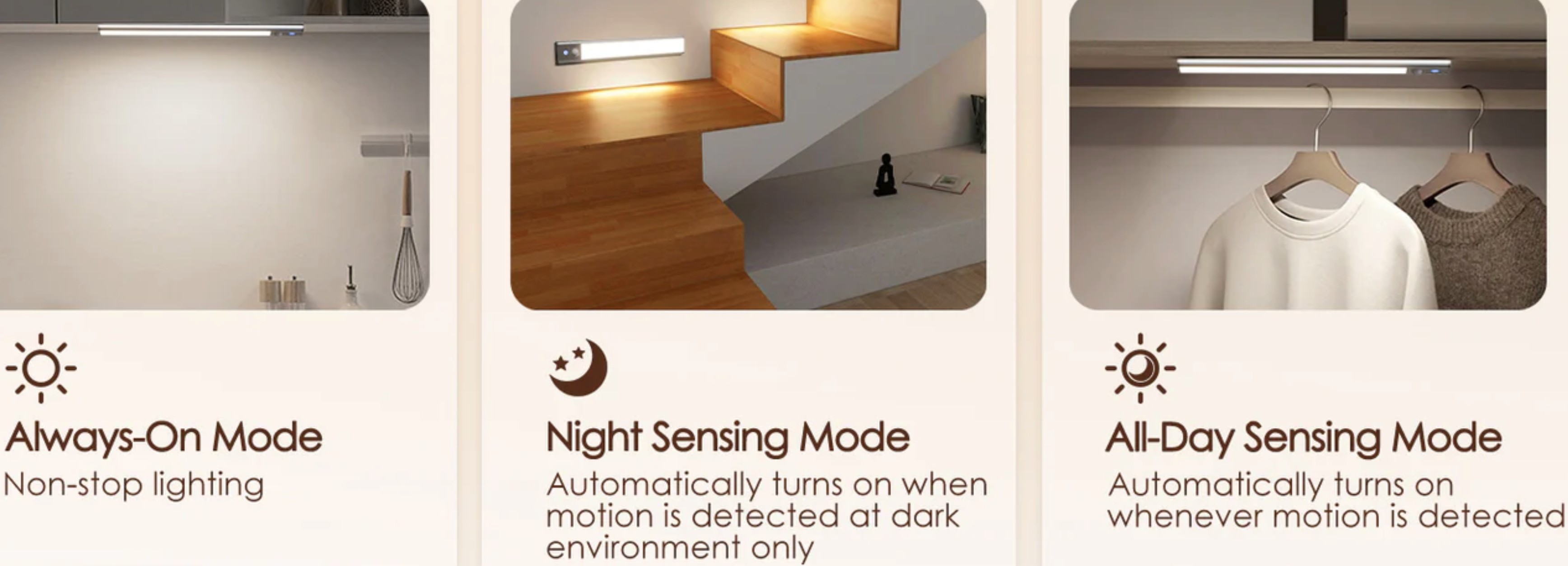 Quntis Body Sensing Lightbar SVR-H4015-PIR30 – lights only when you need it. Perfect for motion-sensitive light, these are great in the bathroom, hallways and cabinets. Terrific staying power.
