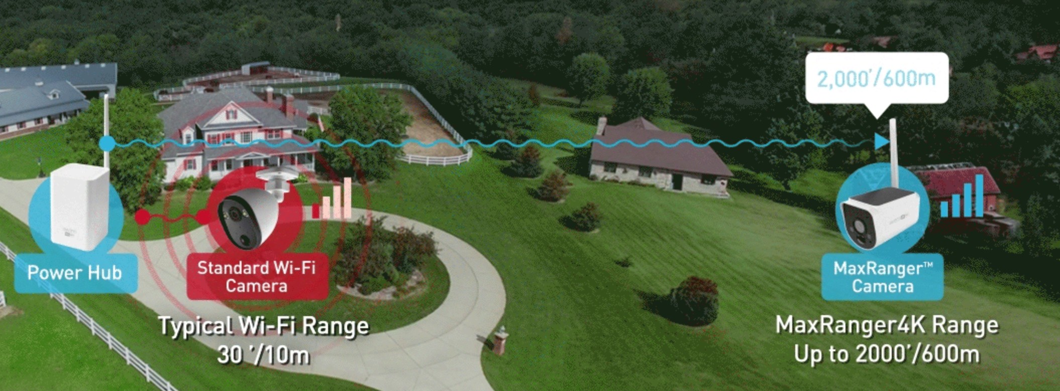 Swann came up with a 600m range (well, at least half that) set of cameras and doorbells. Swann MaxRanger4K up to 600 metres long-range wireless security cameras.