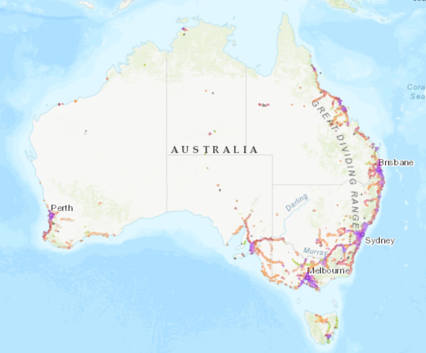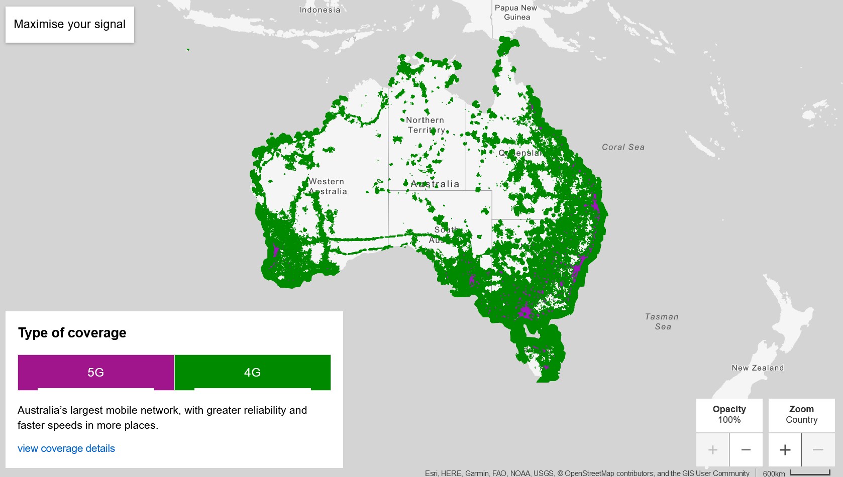 Optus has a coverage map and claims 7000+ sites Australia-wide, with 2600+ new sites and 1300+ upgrades in regional Australia. It covers 98.4% of the population (4G) and 80.5% (5G), and it covers 1 million square km—not much land coverage.