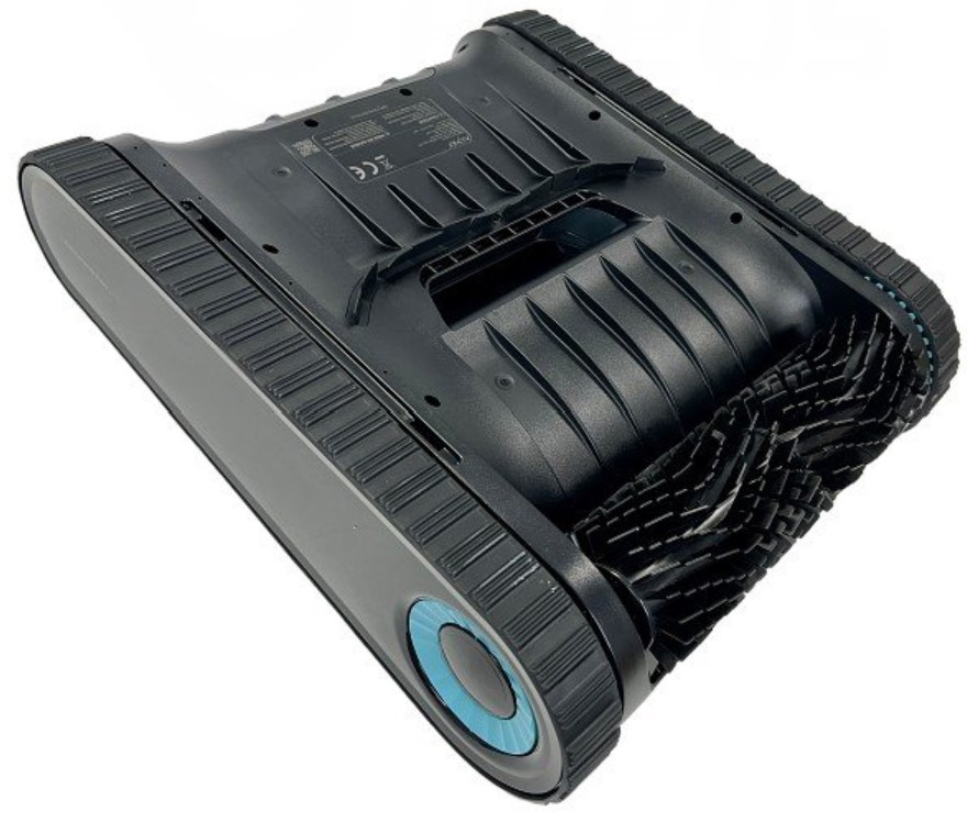 It has twin caterpillar tracks that cover the entire length of each side. It easily climbed walls, and the front ‘scraper’ roller brush belt did an excellent job of cleaning the tile line.