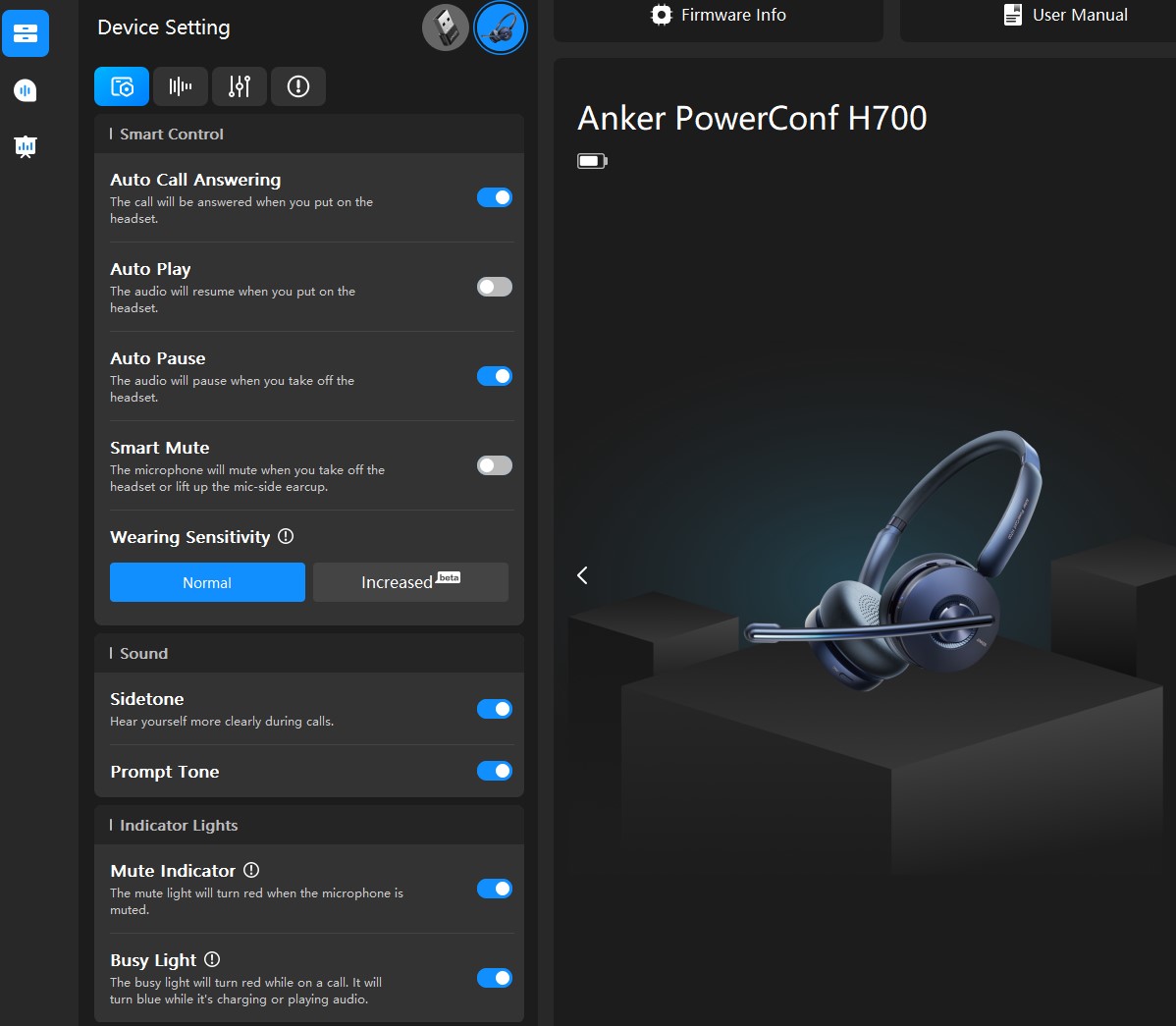 It uses the same AnkerWork Software as the AnkerWork B600 Video Bar – a webcam that shines brightly (review). You must connect to the PC/Mac using the BT Dongle to access it (reasonably standard procedure in UC devices). The PC/Mac version will not update the H700 firmware (as it is connected to the USB BT dongle), so you do that via the Android or iOS App.