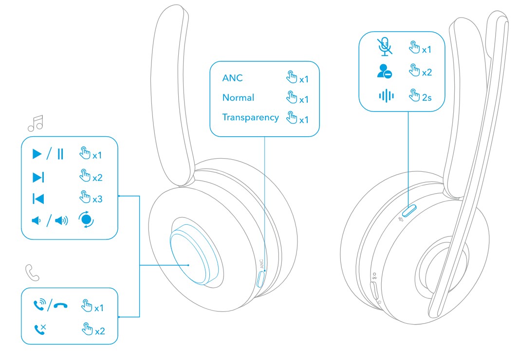 It has a metal adjustable, neoprene padded headband and faux leather replaceable ear pads – important for constant office use. Push button controls are power/Bluetooth and ANC on/off. Touch controls cover LEFT: Play, Pause, Skip Forward, Skip Back, Volume Up and Down, Receive, Cancel and End Calls. ANC, Normal & Transparency. RIGHT: Do Not Disturb & Voice Shield.