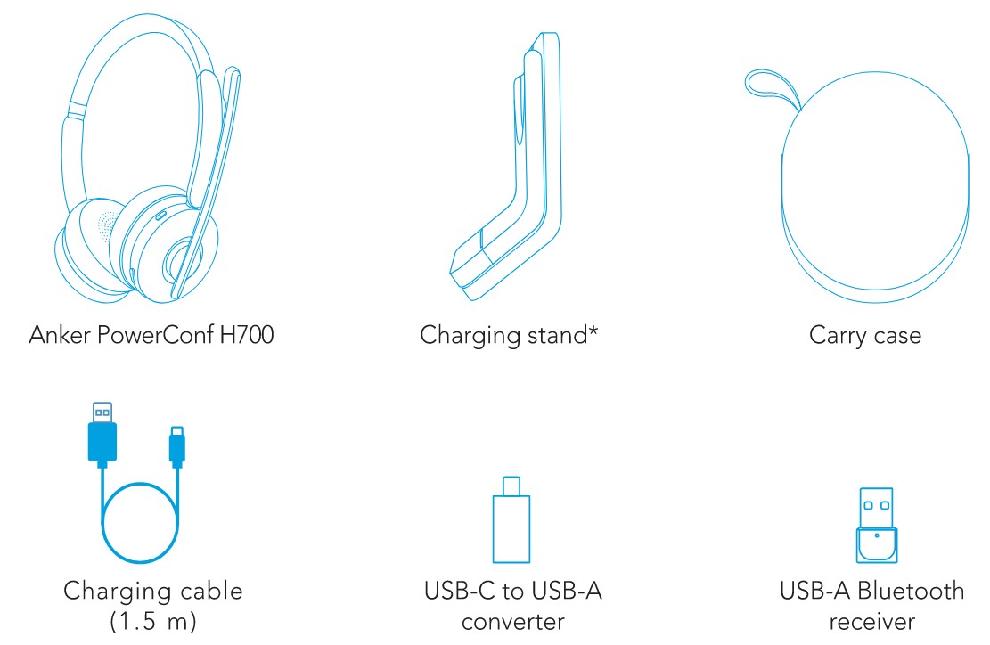 It comes with a charger stand (no charger supplied, and you can charge with USB-C as well), a USB-C cable, and a Bluetooth USB-A dongle to use with a PC or Mac (works with a USB-C adapter as well).