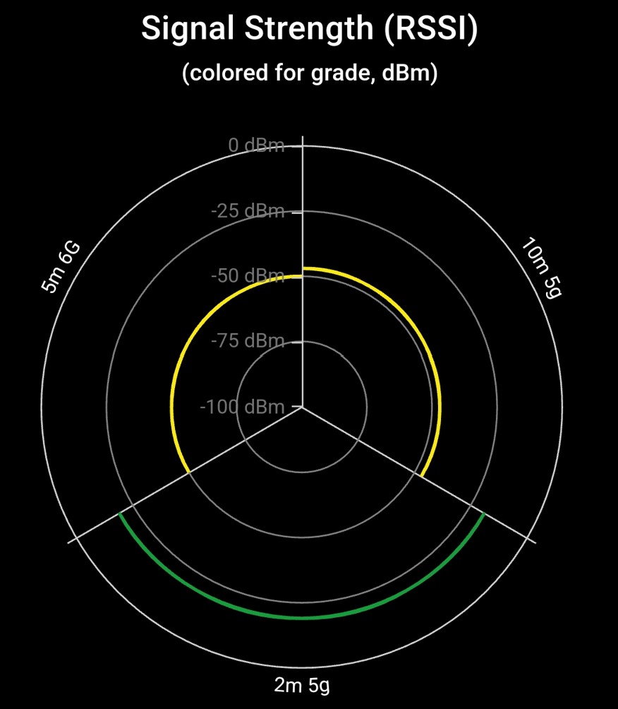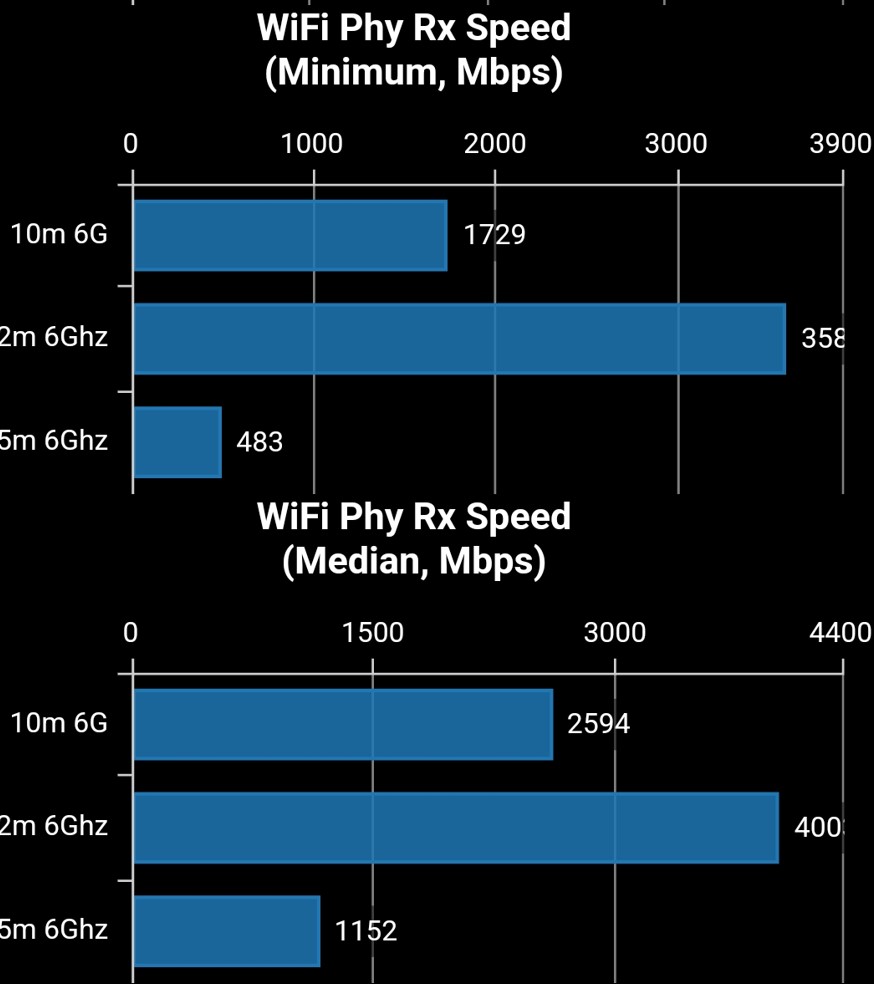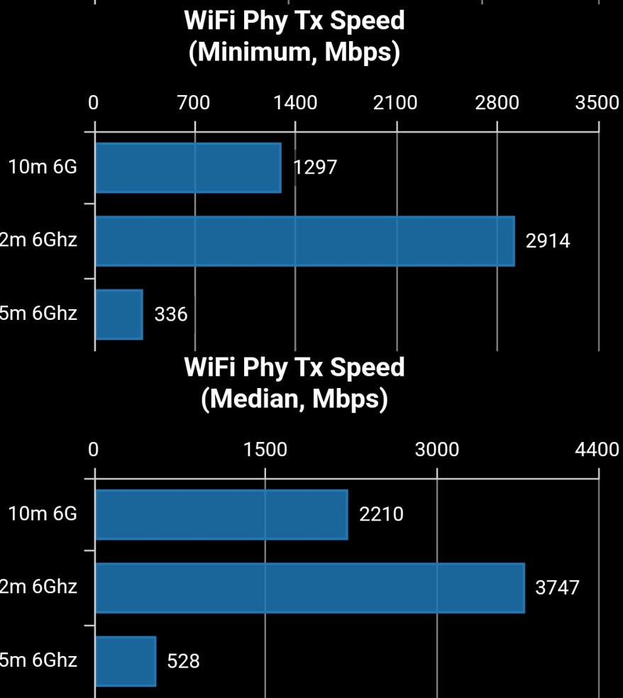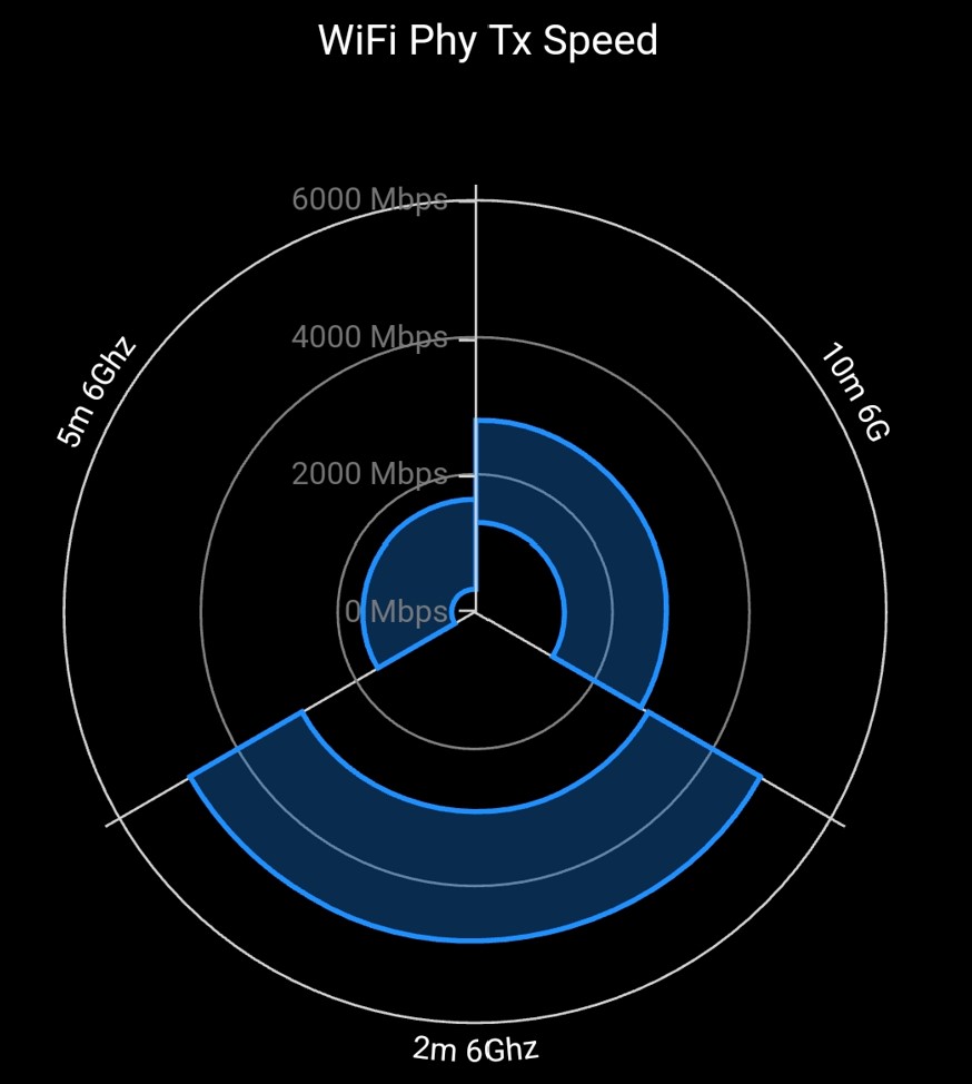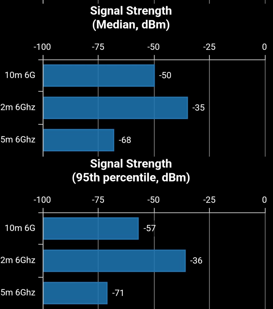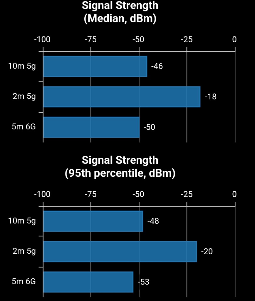 (L) is the 6GHz, and (R) is the 5GHz download/upload internet speeds. This shows that 6GHz drops quickly as you move further away. The 5m (two walls and built-in cupboards) and 10m LOS (line-of-sight) are similar and demonstrate how 6GHz is more affected by walls.