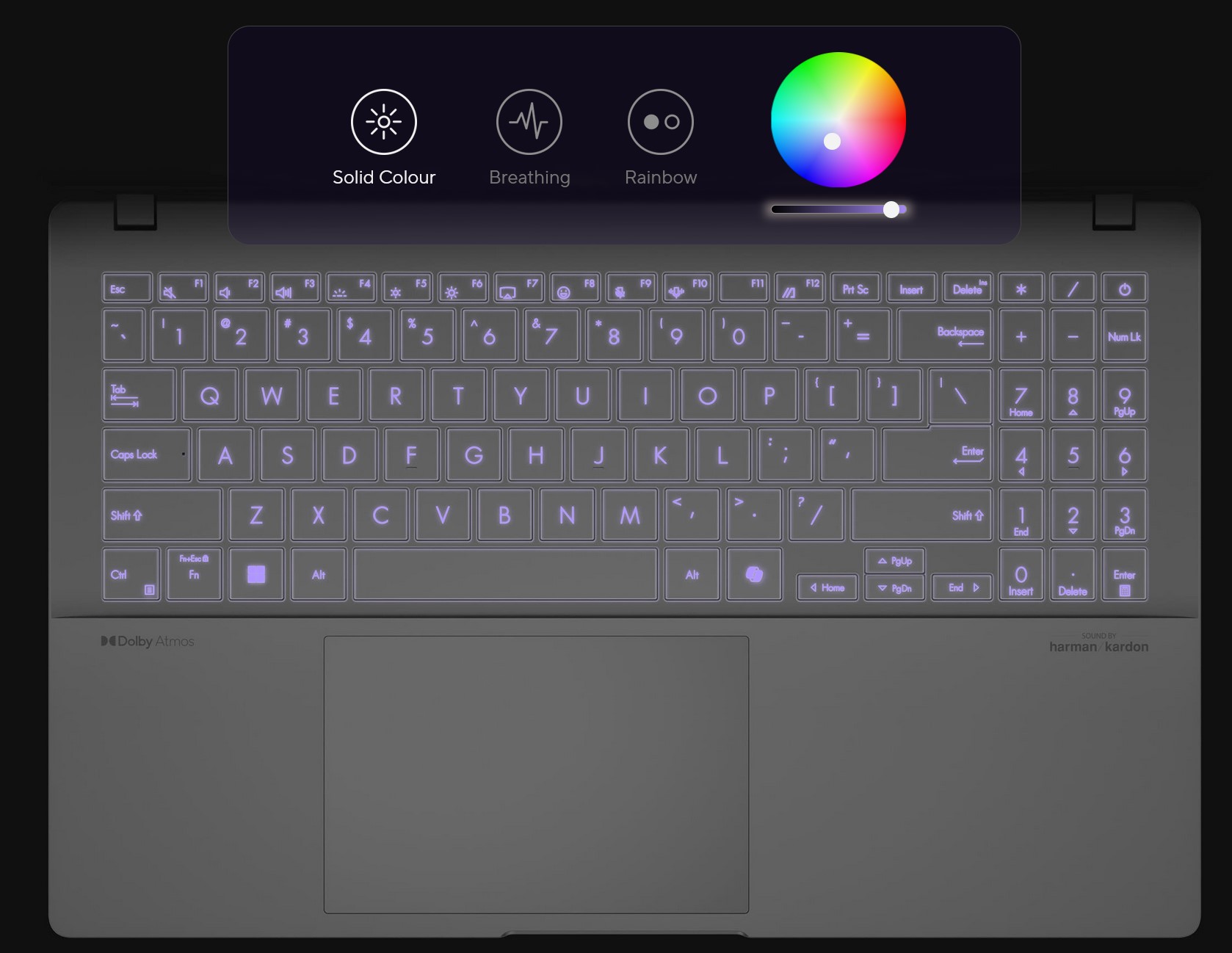 It would have earned Exceed, but the silver keyboard on a silver deck makes reading in daytime and office light difficult. It has a one-zone RGB backlight, and MyAsus can set patterns and colours (hint – select a darker contrast colour).