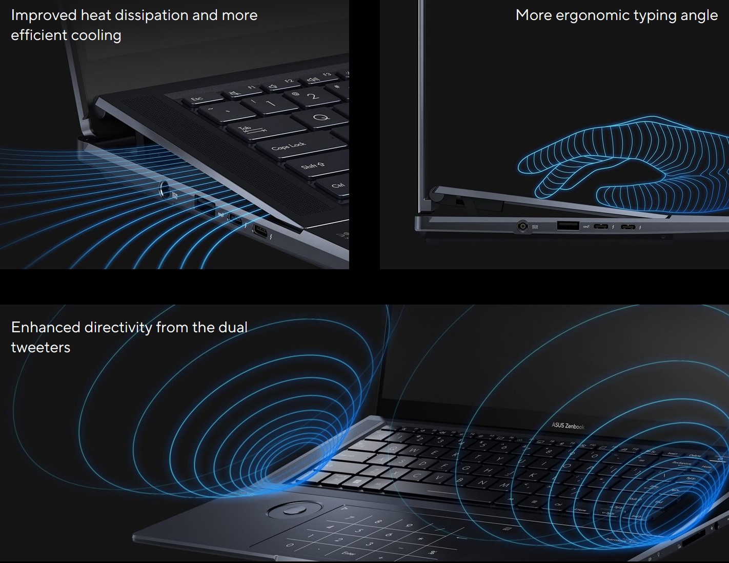 It has two left/right up-firing tweeters from beside the keyboard and two down-firing full-range speakers under the front of the palm rest. ASUS calls it Smart Amp, with Harman/Kardon tuning.
