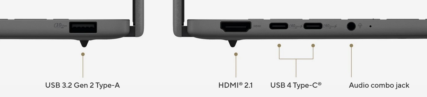 • 2 x USB-C 4.0 (40Gbps) with Alt DP, audio/video/data/charge (no Thunderbolt 4)