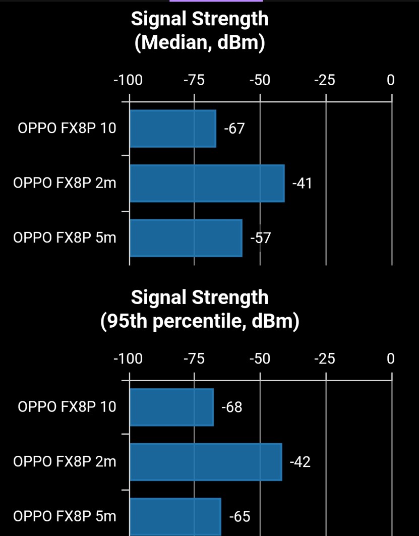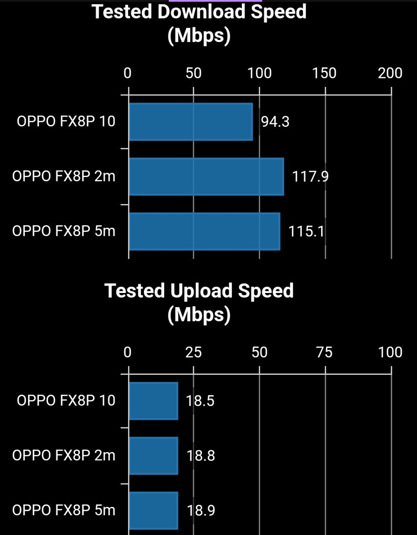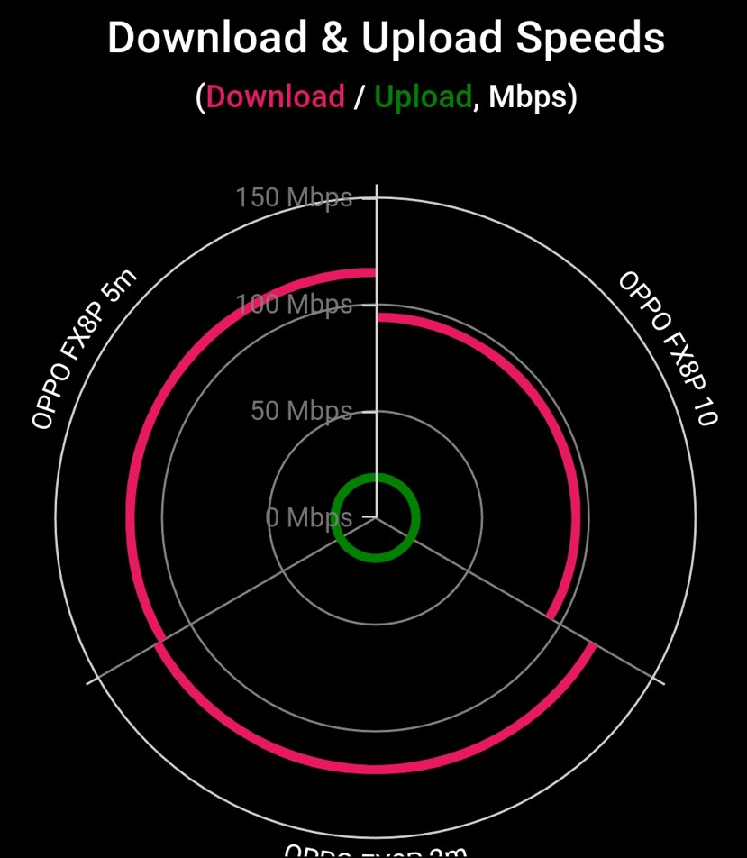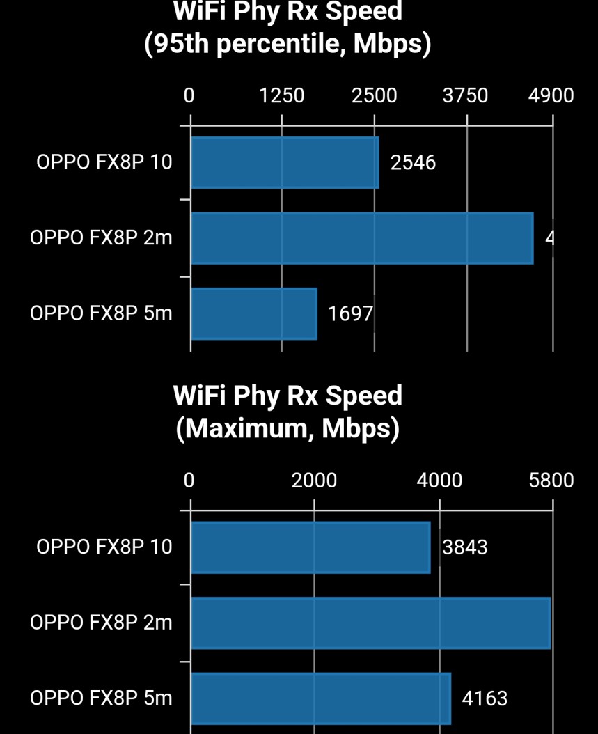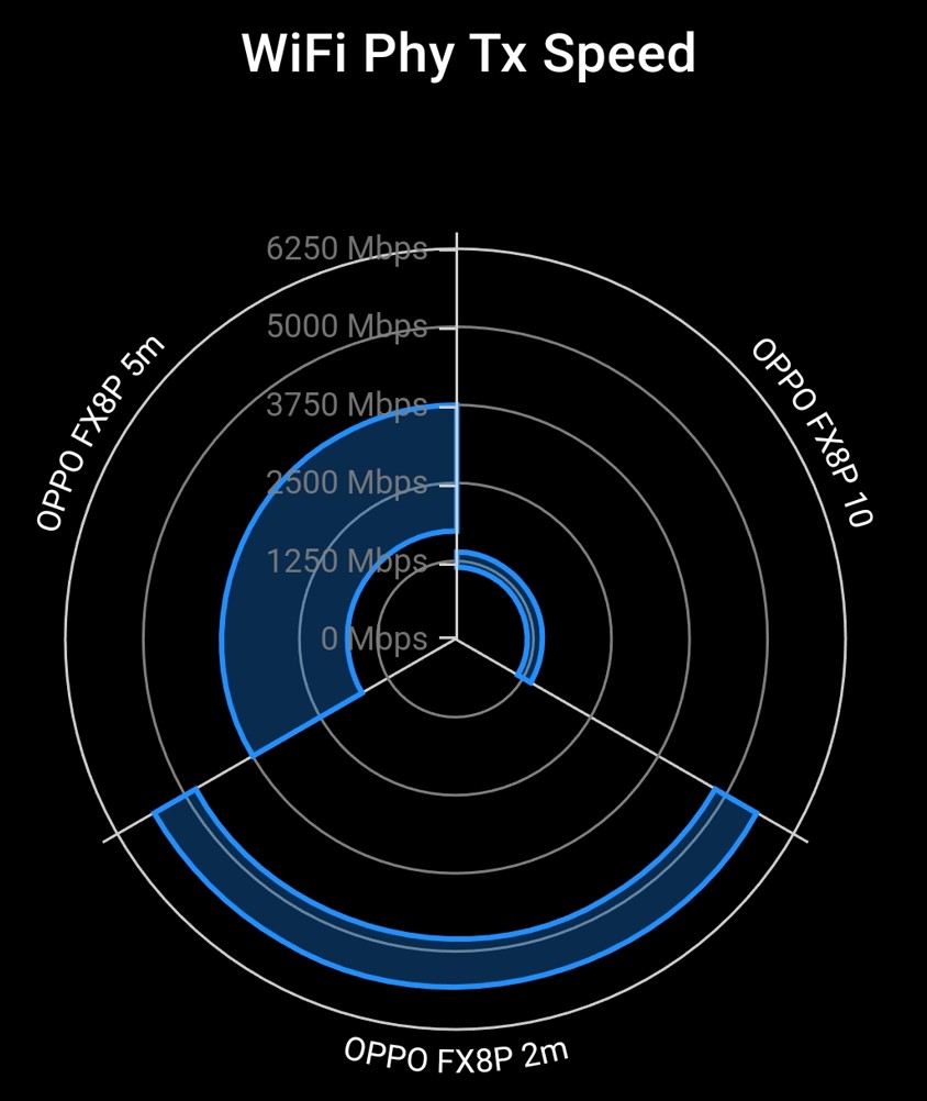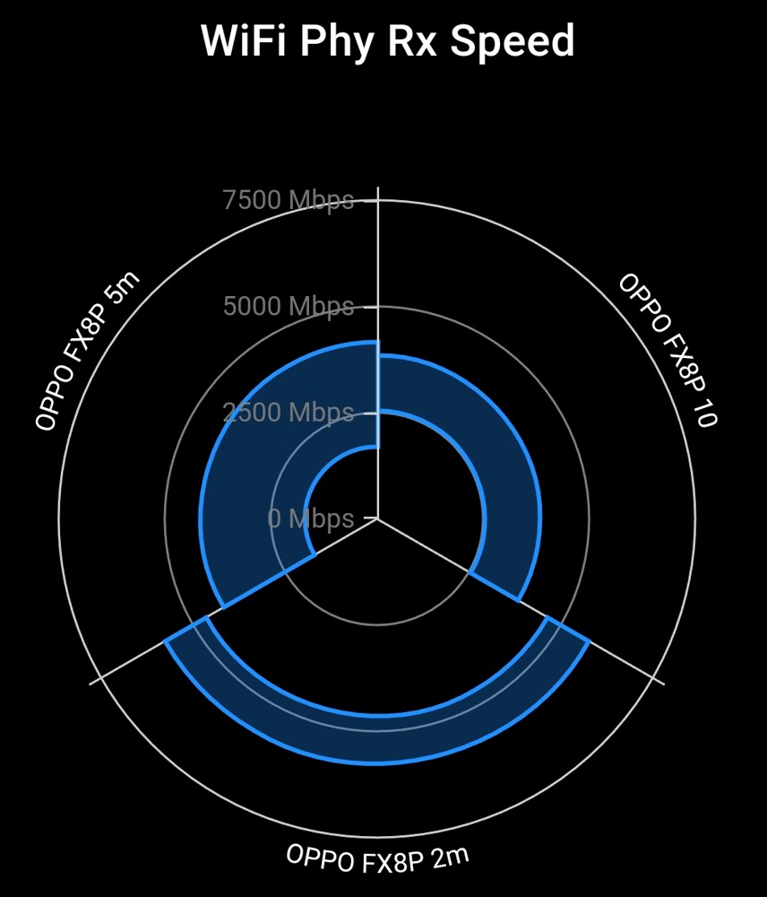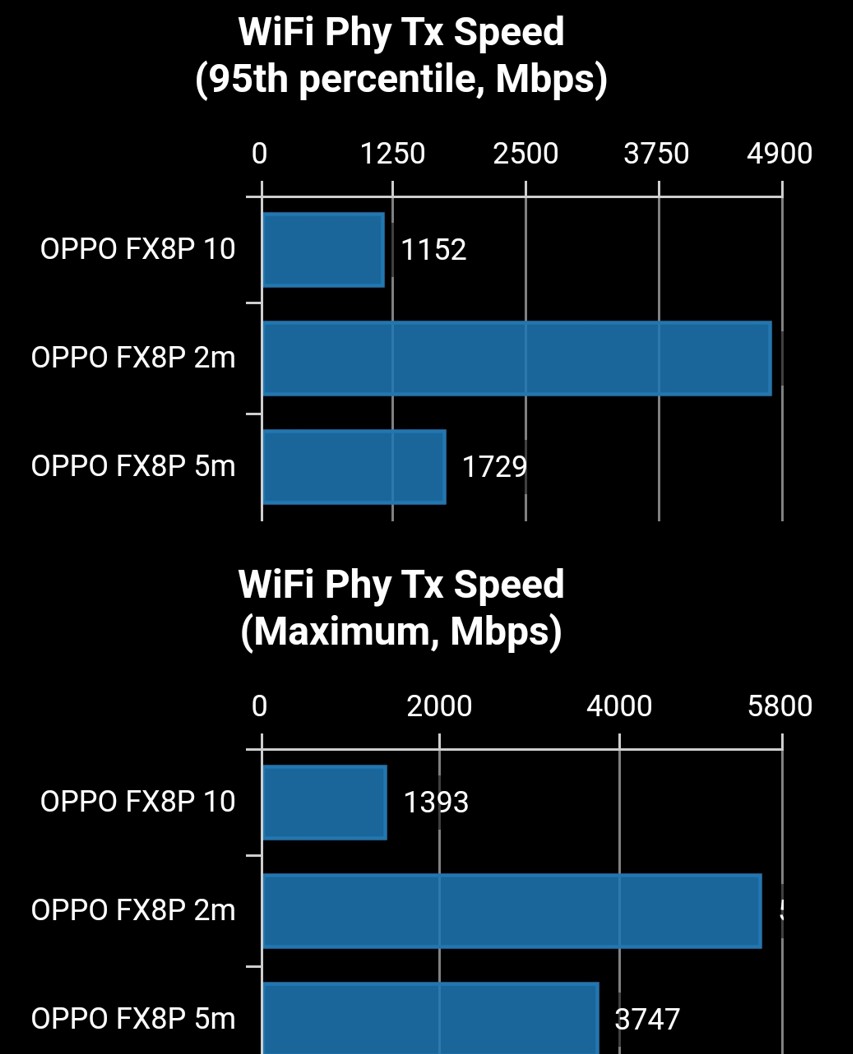 The not useful figure is that the router and satellite are powerful enough to transmit a usable Rx/Tx signal to host devices up to 10m. We expect that anyway. OPPO got 5800Mbps Rx/Tx off both devices.