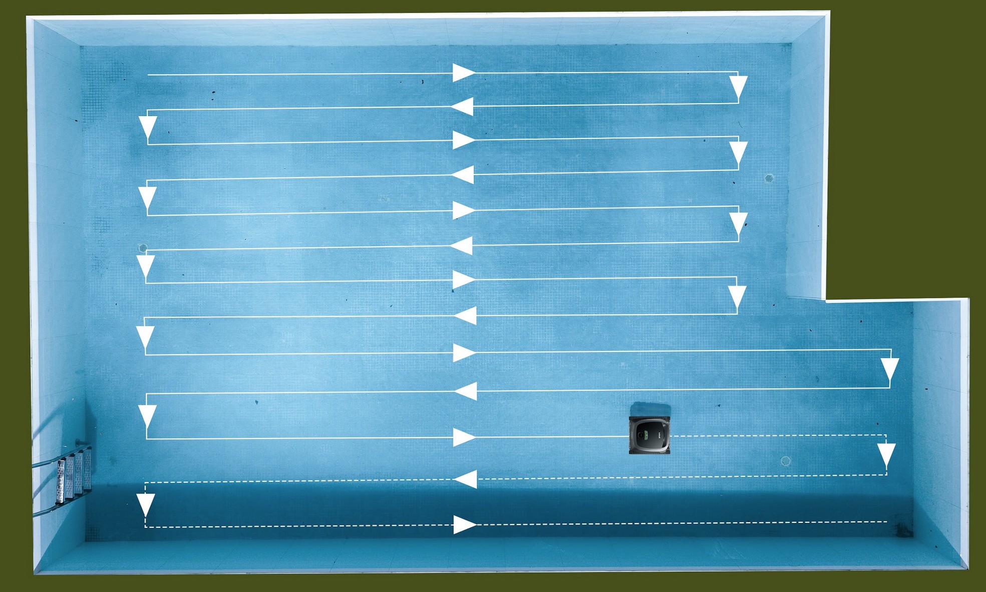 Once submerged, it seems to wander around slowly and aimlessly. That is to make the temporary map (it makes a new one each time). Once that is done, it increases speed and starts cleaning in an S-shape (U-shape) along the long direction.