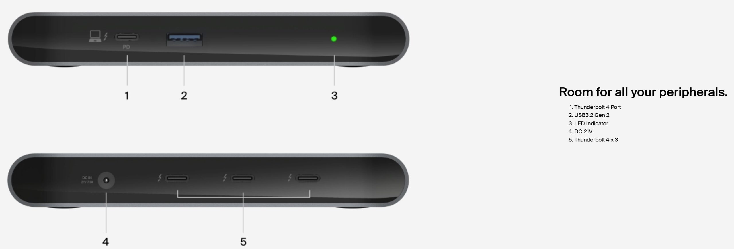- 3 x Thunderbolt 4 ports downstream 5V/3A/15W