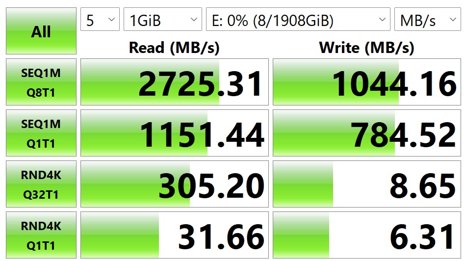 - TB3 external SSD Sequential read/write data X2 lane speeds 2725.31/1044.16MBps.