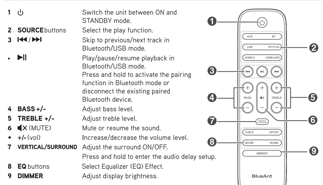 - Remote control with four sound pre-sets – voice, sport, movie and music