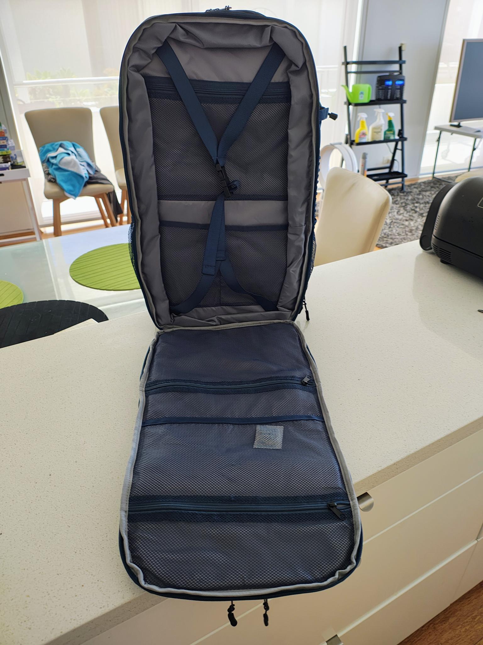- Gear compartment, clothes compartment, multiple zippered smaller compartments