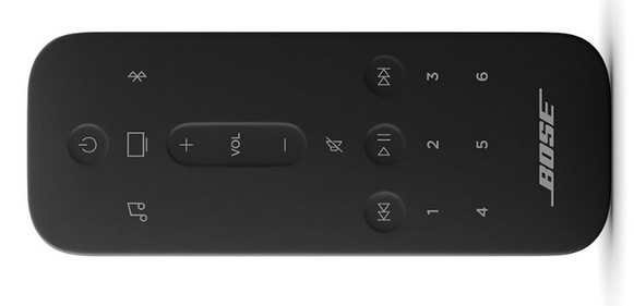 It has power, source buttons (music, TV, Bluetooth), volume, mute, media playback buttons (skip, play/pause) and six pre-set buttons (for audio or video channels). It is not highly responsive, but that could be an issue with IR sensitivity. In reality, you will use the TV remote most of the time and the App to make any changes.