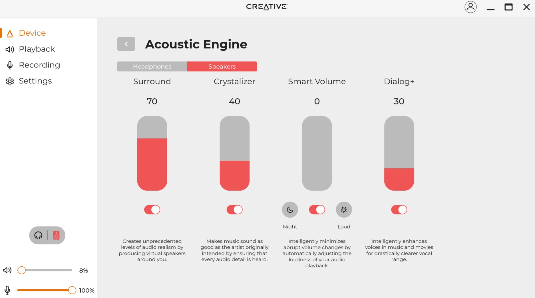 The Acoustic engine has settings for surround (psychoacoustics), as the artist intended (hence the flat neutral sound signature), smart volume (for night TV watching) and dialogue for Crystal voice clearer sound (typically for 3.1 systems, but it seems to make quite a difference).
