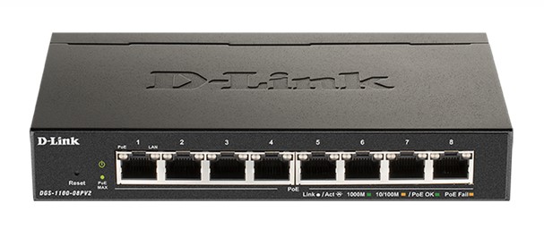 The D-Link DGS-1100-8PV2 8-port, PoE+ smart managed switch provides up to eight PoE+ (Power over Ethernet) to PoE-capable IoT devices like security cameras and other switches.