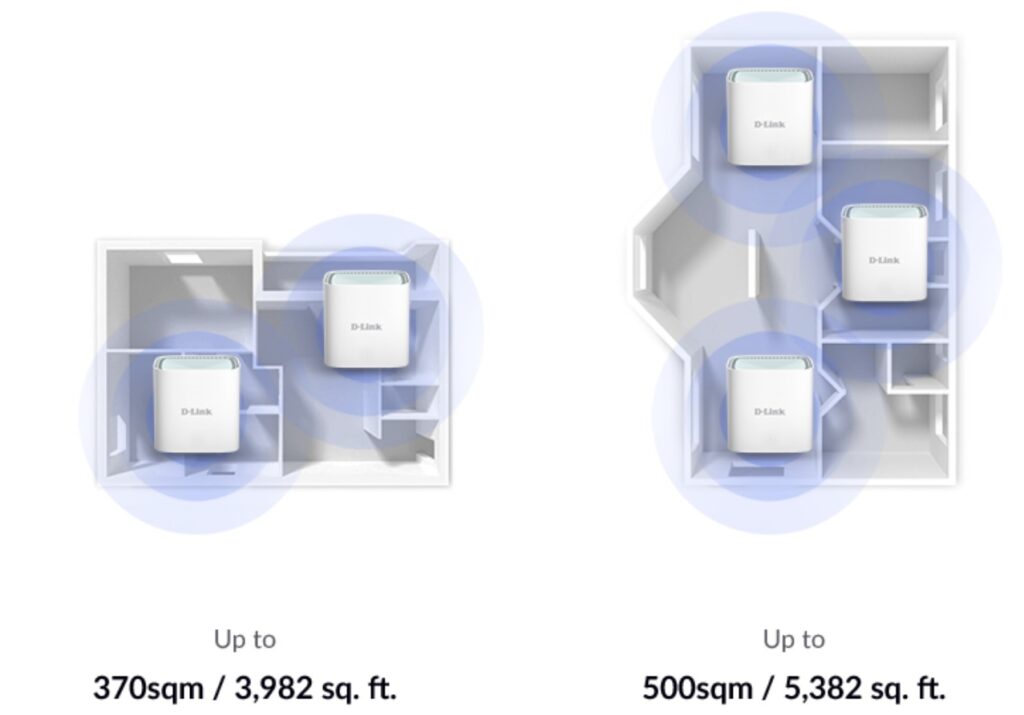 Given that each Satellite needs to be well within that 20m circle and can also cover 300m2, it is fair to say that the 2-pack can provide a Wi-Fi AX signal to 450m2 and a 3-pack to 600m2. D-Link quotes less, and that is because of the necessary signal overlap and that few Routers or Satellites are correctly placed dead centre of the Wi-Fi action or line-of-sight of each other.