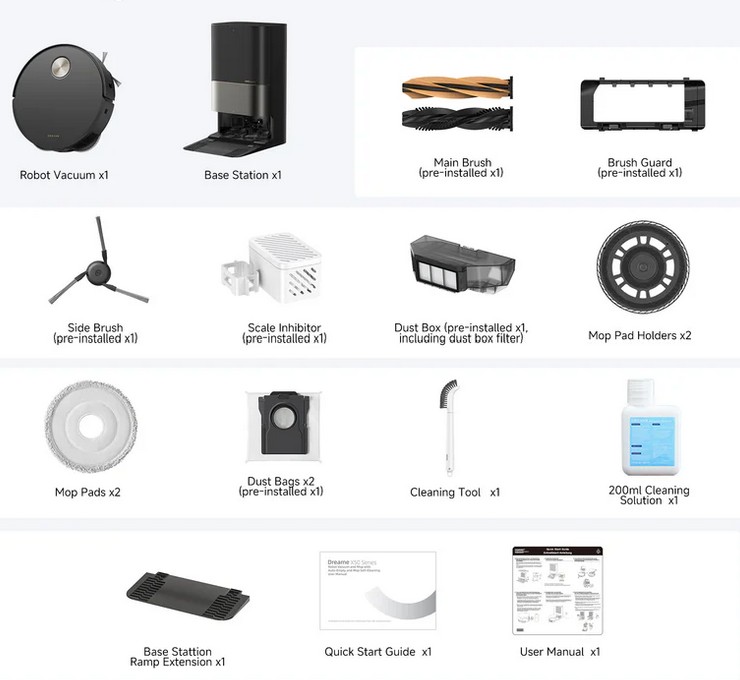 | Inbox | 1x Base Station and extension ramp 1x Robot 1x Side Brush 1x Power Cord 2x Mop Pad Holder and pads 1 x Cleaning Brush 1x Multi-Surface Floor Cleaner 200ml 2x Dust Collection Bag (replacement) 1x User Manual | Pass |