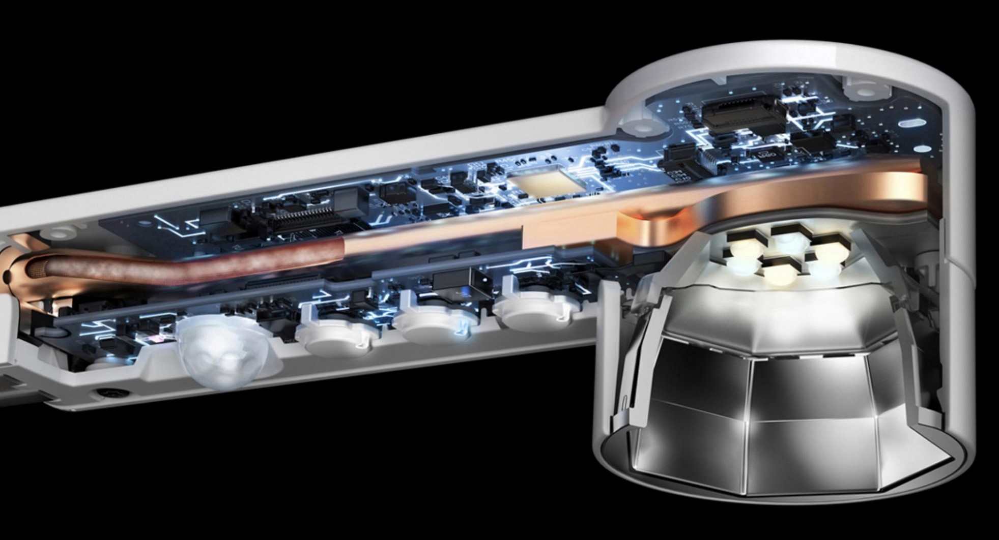 Dyson Lightcycle uses a vapour chamber principle that you find in some flagship smartphones. A vacuum-sealed copper tube draws heat away. Inside, a drop of water evaporates, dissipating heat along the pipe as it condenses before returning to the LEDs by capillary action. It provides a non-stop, energy-free cooling cycle. And. It is effective – you can touch the LED head, and it is cool!