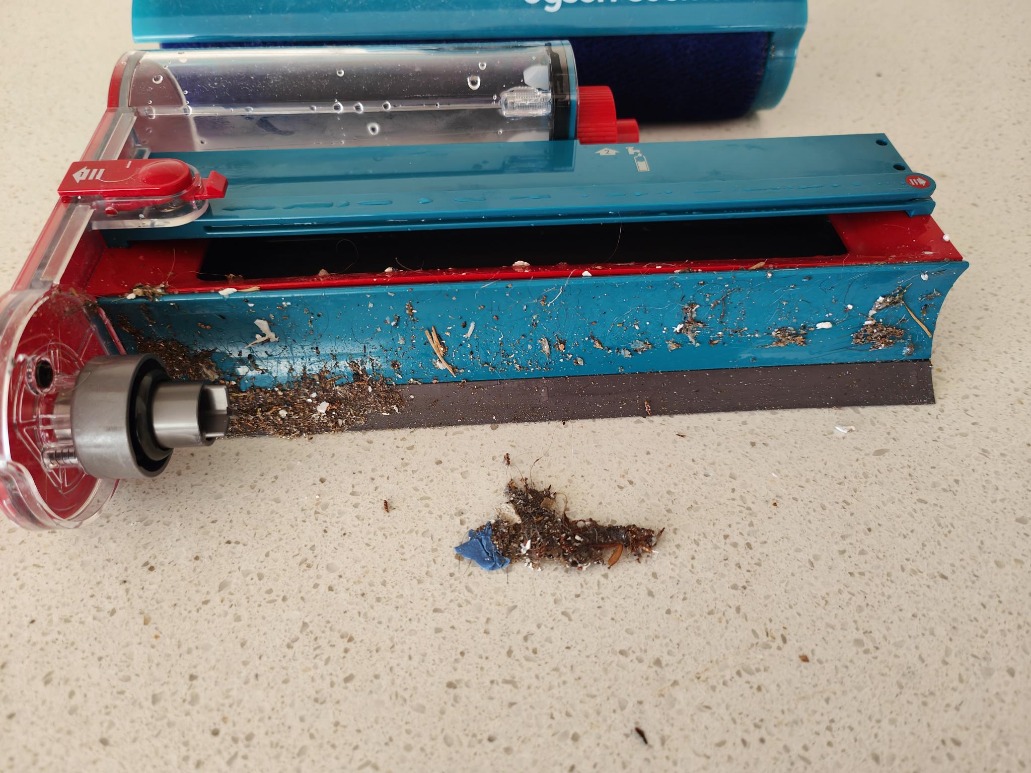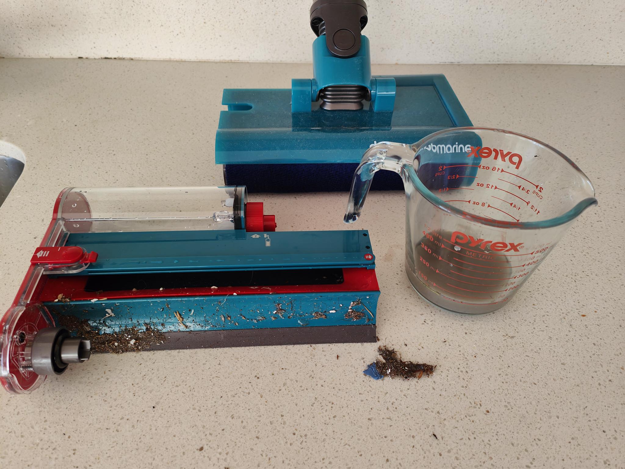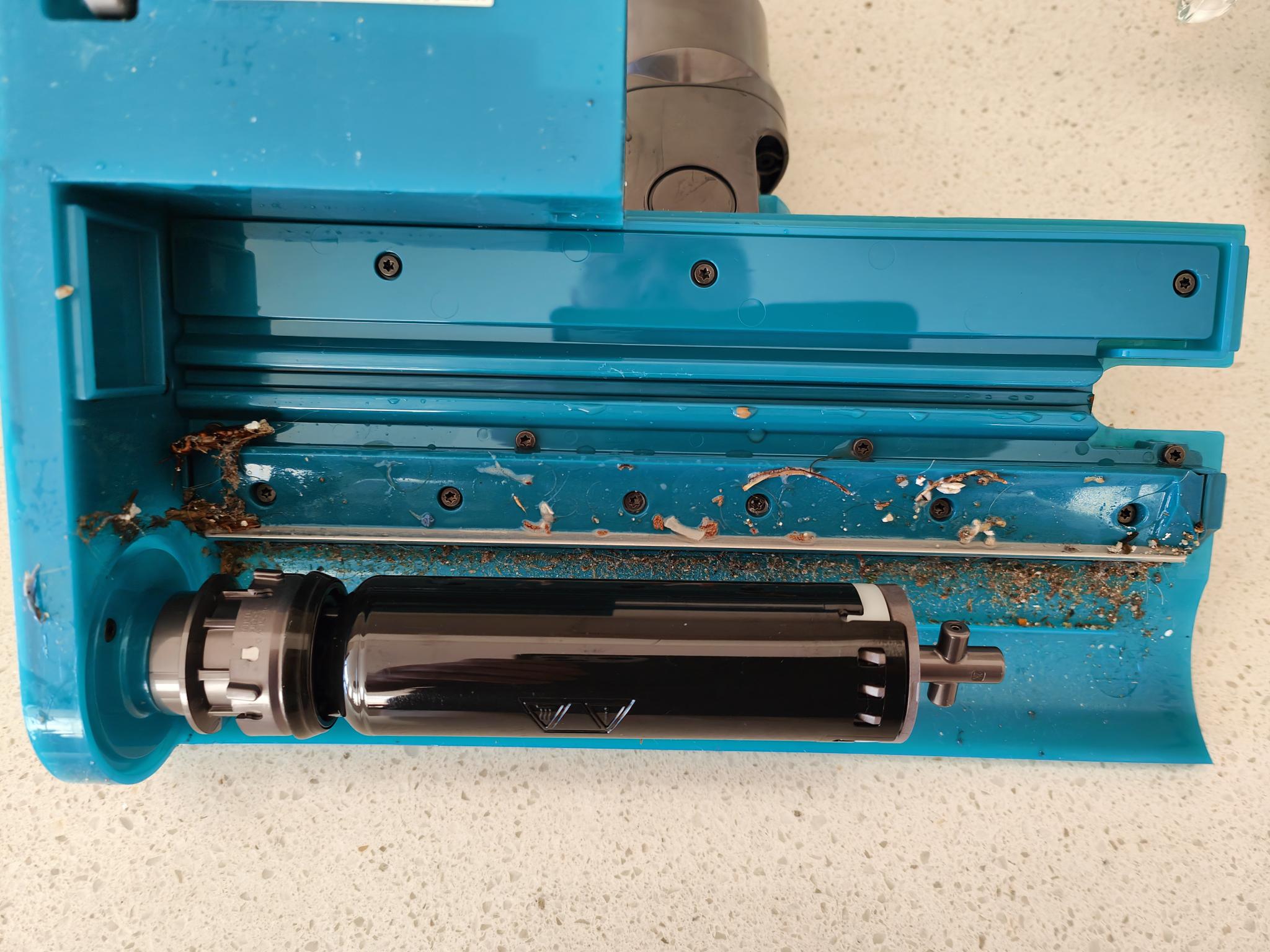 The roller is squeegeed as it rotates to lift off excess water and detritus and place it in the dirty water tank. It collects about 100ml from the 300ml clean tank – the rest is in the roller and the floor.