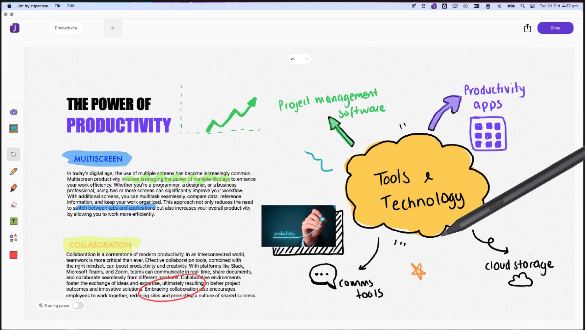 It acts like a digital sketch pad that sits over the top of a desktop environment, allowing you to sketch, take notes, and transfer content. Jot is free to all espresso 17 Pro 4K owners or those that purchase the espressoPen.