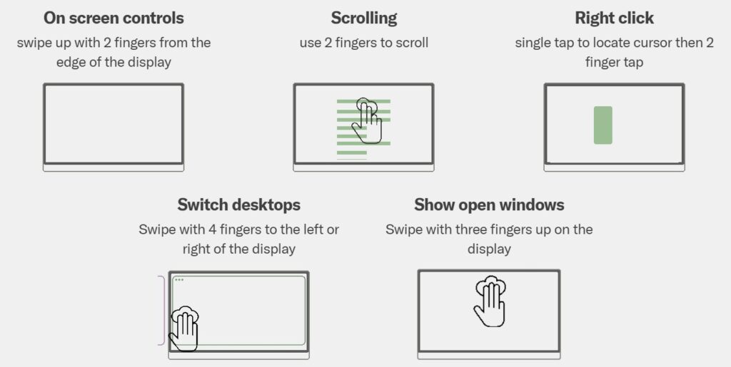 A two-finger swipe up from the bottom bezel reveals brightness, contrast and volume; Max brightness depends on Watts.