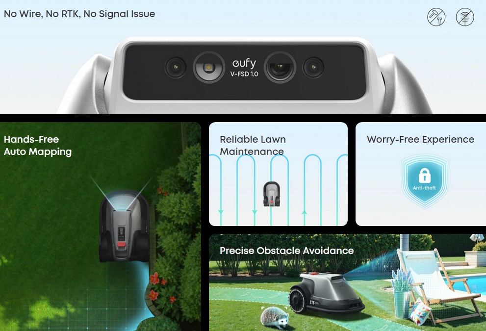 The trick is eufy’s new TrueVision camera system, which features three sensors/lenses – a semantic AI camera and two 3D stereo cameras. The Eufy E15 robot mower recognises its surroundings in real time.