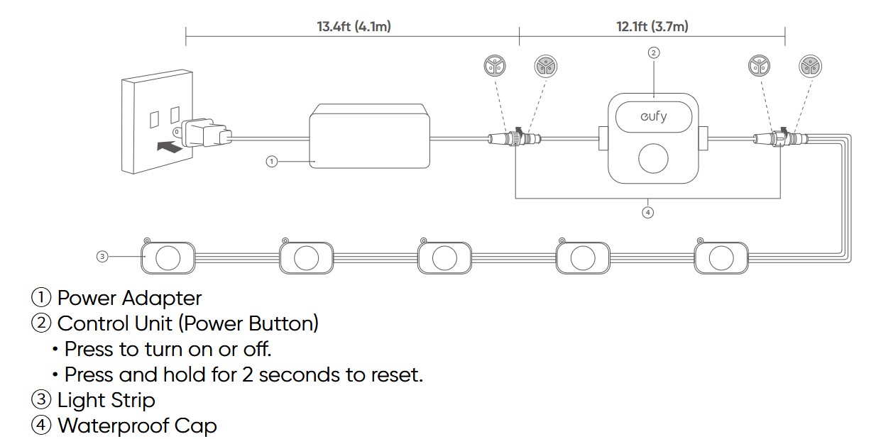 The IP67 power adapter has a total of 4.1m cable length, followed by the IP65 controller (3.7m) cable length. Our kit had two 3.6m extender cables unique to the power adapter and controller.