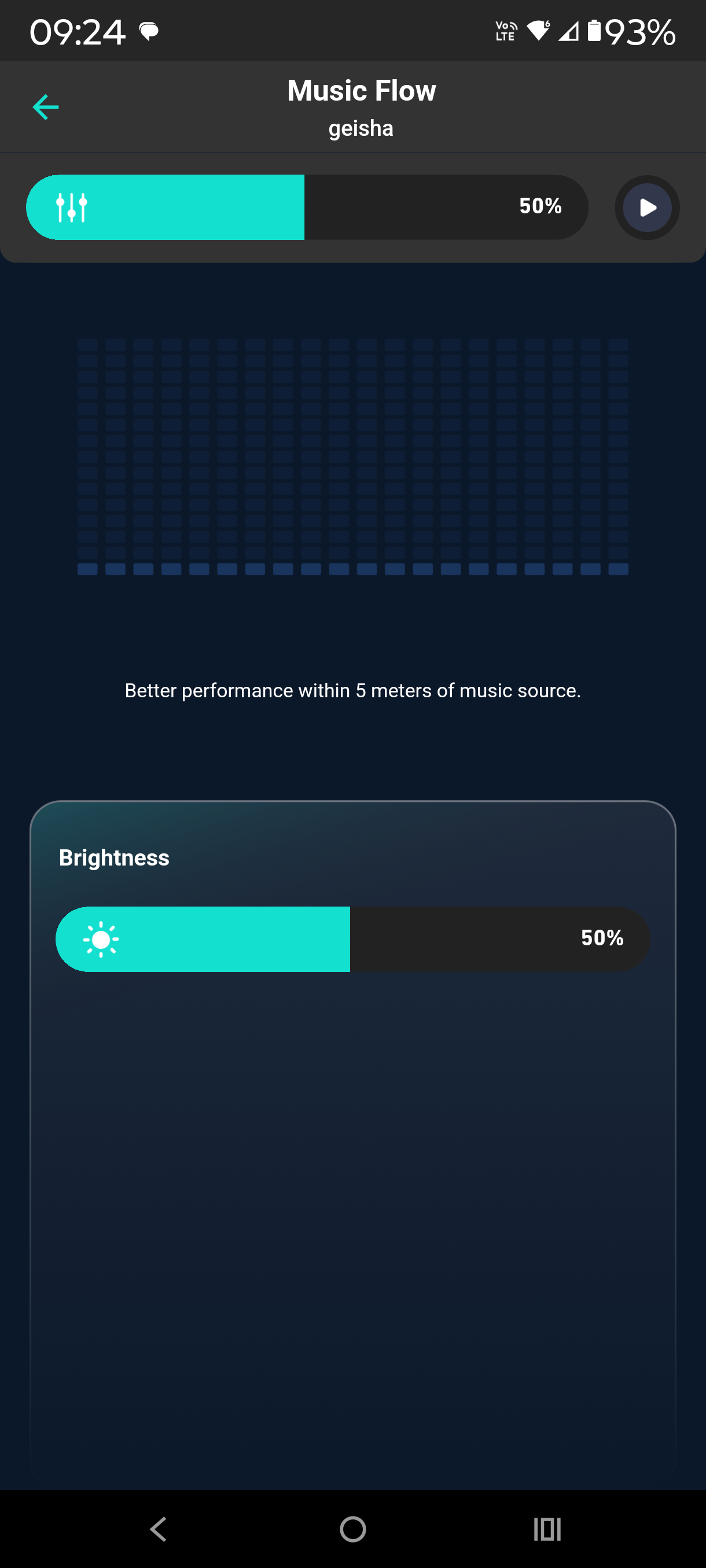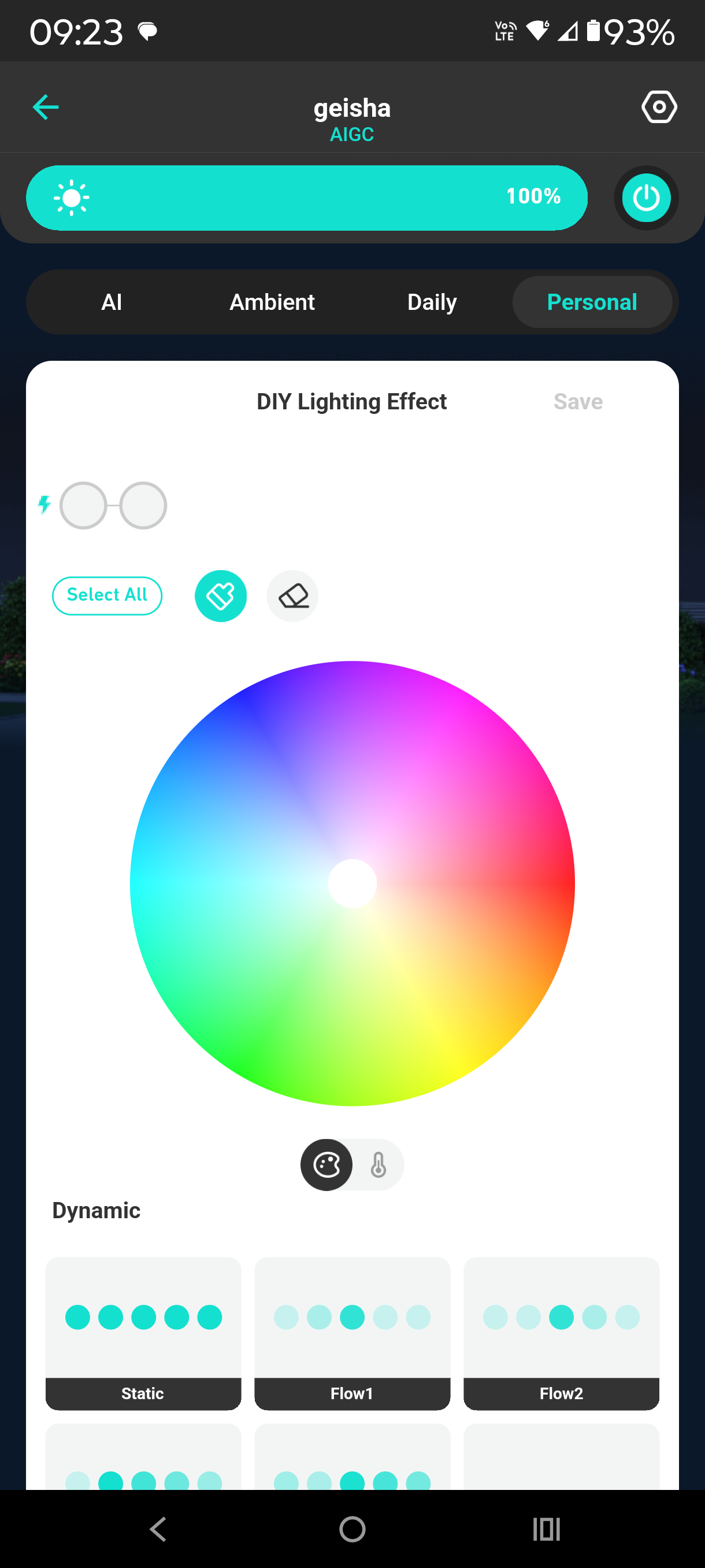 The screenshots are self-explanatory. AI gives you the option of a light show just for you, and the other presets are pretty standard. There is also a Music Flow setting (not tested), which we assume pulses to music.
