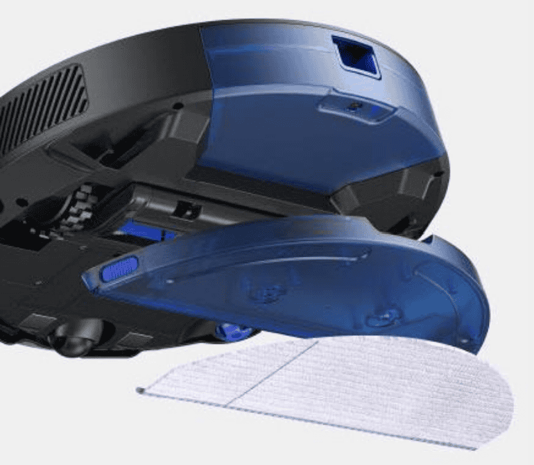 It’s a typical round robovac 345 x 345 x 97.2mm x 3.5kg with a top LiDAR turret, front and right-side IR sensors, 15cm rotating brush, and a right-side single whisker brush. The vacuum has a removable dust bin and a detachable static plate mop attachment to simultaneously vacuum and mop.