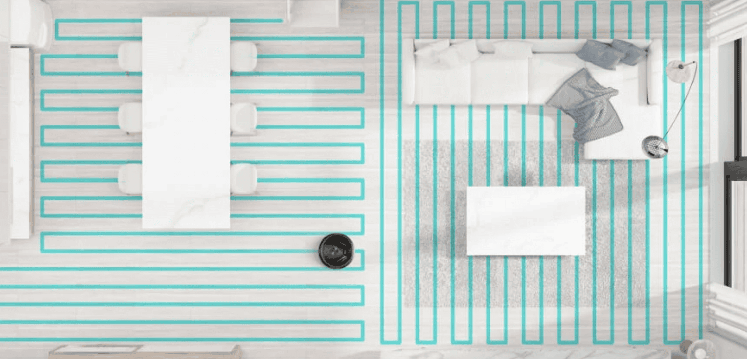 On its first run, it creates quite a good map. It does the edges first, then a U-shaped clean with different rooms defined by colours that you can rename. You can divide or merge rooms, set no-go zones/virtual boundaries, and even no-map zones. The map auto-updates and you can autosave this and multiple floor maps (the base station must be moved to each floor or buy a base station approx. $30).