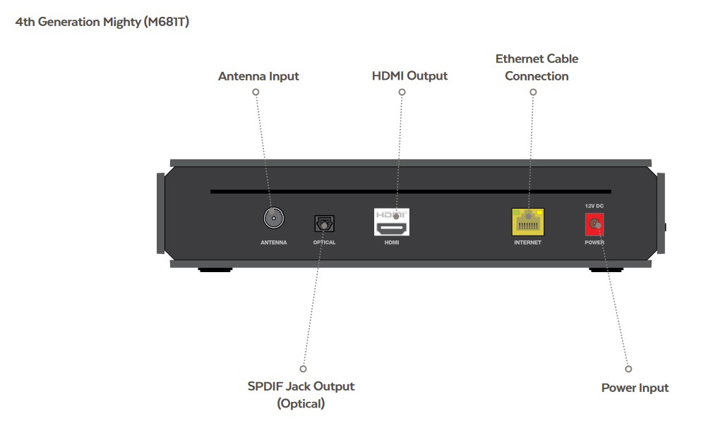 The rear connections are an RF antenna, HDMI 2.0 (M681T only), Ethernet (speed unknown) and a 5.5mm 12V/2A/24W DC power plug.