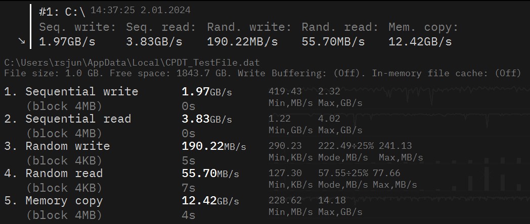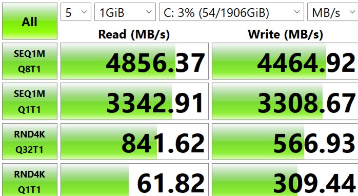 The review unit came with a Lexar NM7A1 2TB – a mid-range PCIe 4×4 with commensurate speeds (sequential read/write 5000/4000Mbps). Top-tier PCIeE Gen4x4 SSD can reach as high as 7000/5000Mbps.