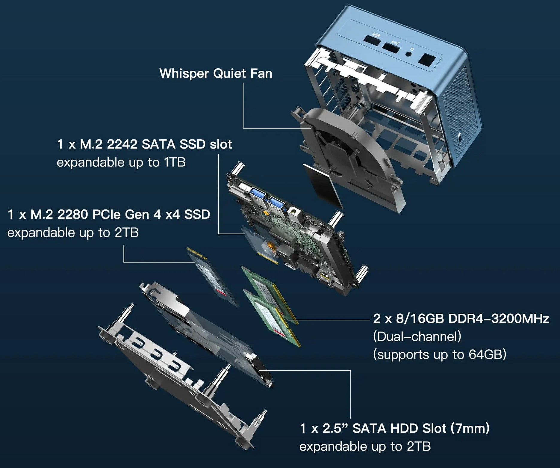 - 1 x 2.5” x 7mm SATA HDD slot for up to 2TB (ditto)